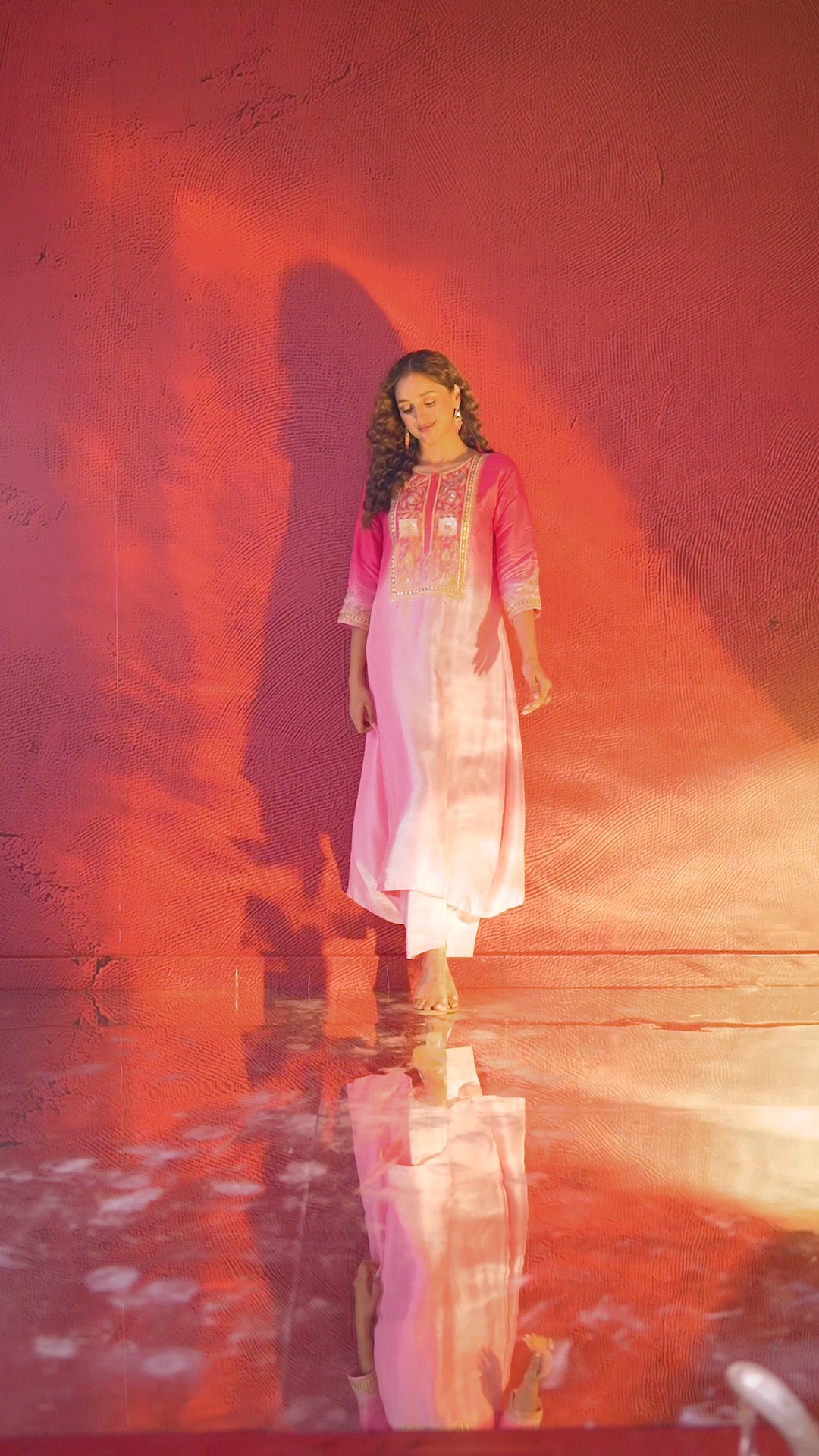 Introducing our stunning Peach ombre-dyed Raw silk kurta. Crafted with intricate sequin, gotta patti, aari taari and resham thread detailing. Paired with matching solid pants. Apt for semi formal wear.