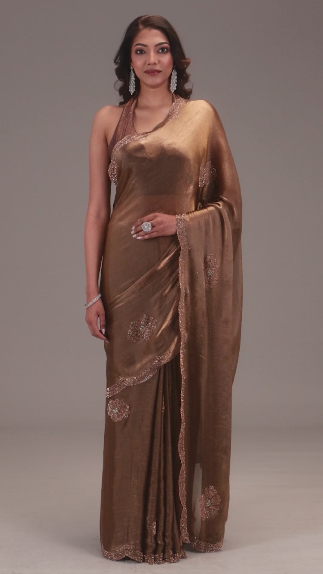 This magnificent saree showcases a luxurious Cosmo Tissue material embellished with golden thread handwork. Its subtle luster captures and reflects light, making it a remarkable option for any significant occasion. The accompanying blouse adds a delicate touch, rendering it perfect for elegant weddings, formal evening gatherings, and classy receptions. The sheer fabric drapes gracefully, accentuating your natural silhouette and exuding timeless sophistication.