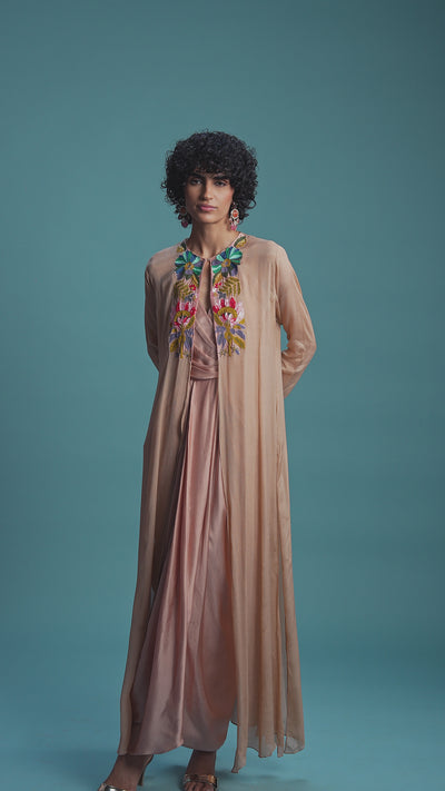 Make a charming statement in this elegant Blush Pink Draped Dress and Shrug Set. The ensemble features a beautifully flowing satin silk dress, complemented by a long, sheer chinon silk shrug beautifully embellished with intricate handwork, including sequins and beads.