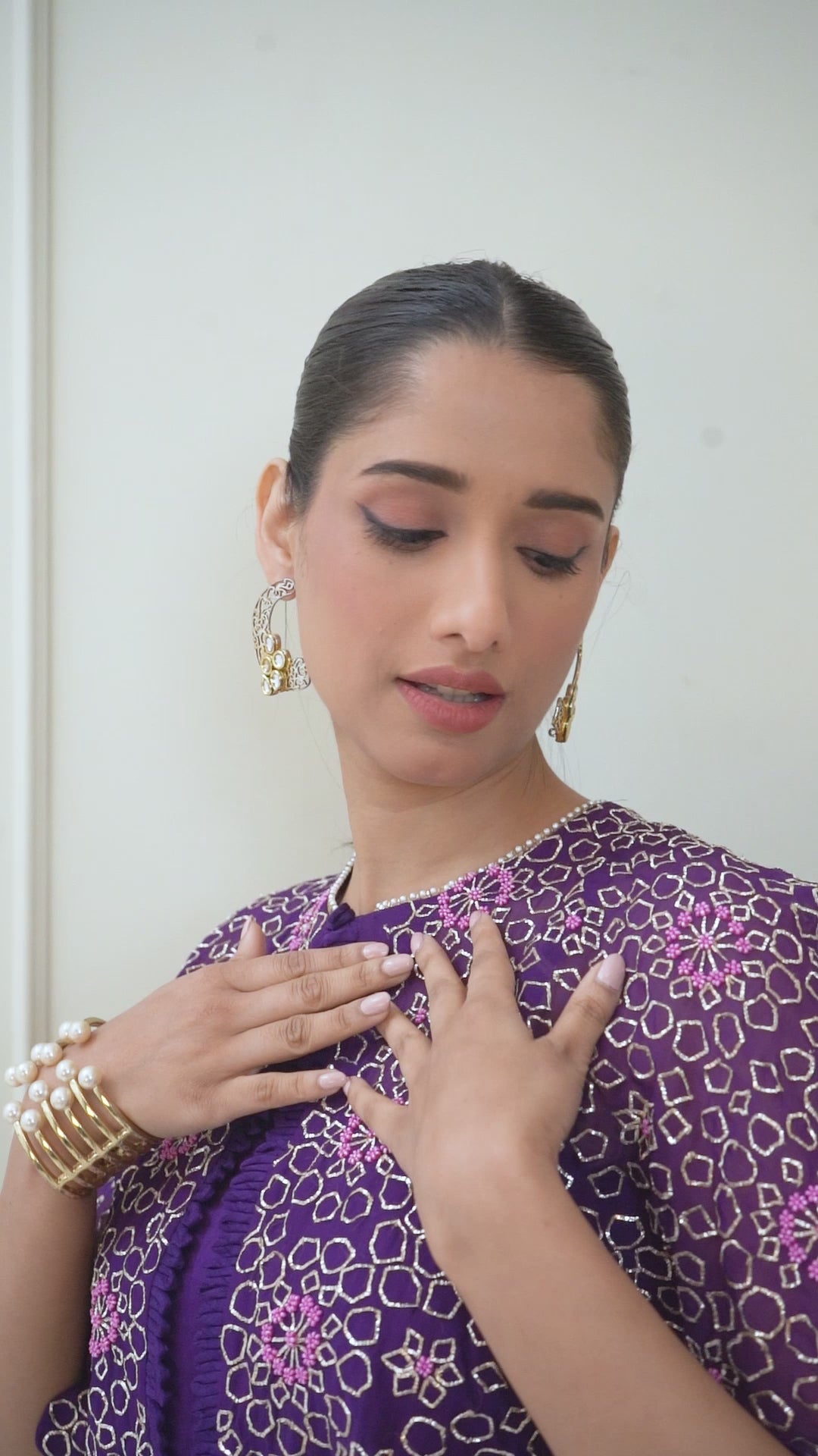 Party purple embellished Italian silk palazzo set, featuring a designer outfit adorned with cut dana, thread, stone, sequins and zari handwork. The ensemble includes a stylish short cape layered over a solid crop top. Paired with matching flared solid palazzo pants for a contemporary silhouette. Rich in detail and color, this set blends traditional craftsmanship with modern flair. Perfect for festive celebrations and special functions.