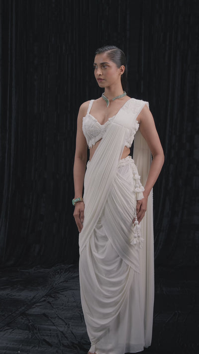 This exquisite pearl white drape saree is a vision of modern elegance. The lightweight and flexible spendex lycra fabric ensures a graceful and flattering silhouette, while the intricate work of beads, zari, cut dhana, and sequins adds a touch of opulent shimmer. Paired with a beautifully embellished blouse, the ensemble creates a stunning and contemporary look perfect for a sophisticated event. The saree's draping, combined with the detailed craftsmanship, makes it a true statement piece.
