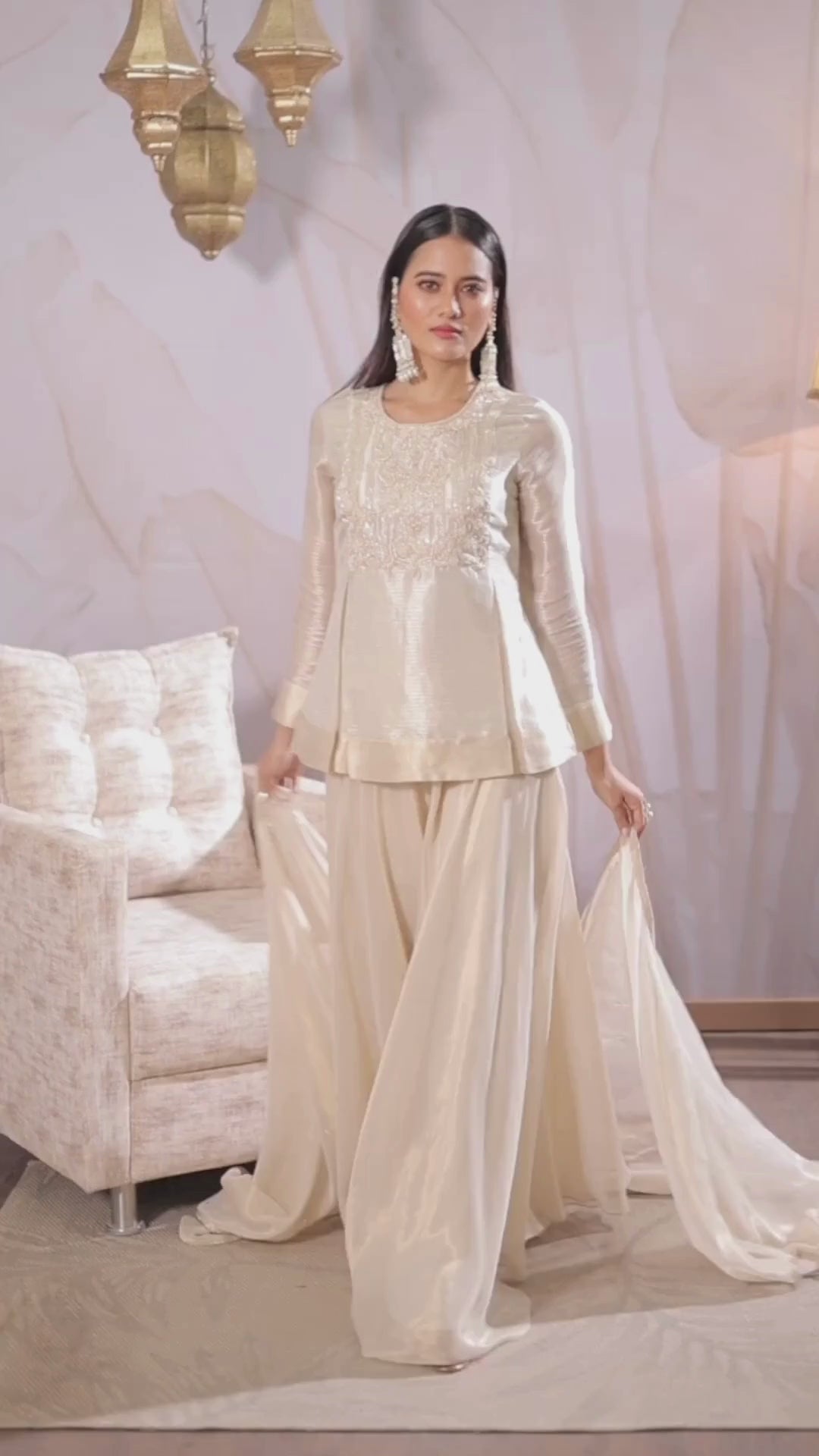 Introducing our Pearl White Embellished Tissue Organza Silk Palazzo Set. This exquisite ensemble features delicate beads, zari and zardosi handwork, adding a touch of elegance. Paired with flared palazzo and a matching embellished dupatta, it’s perfect for special occasions. Elevate your style with this stunning set.