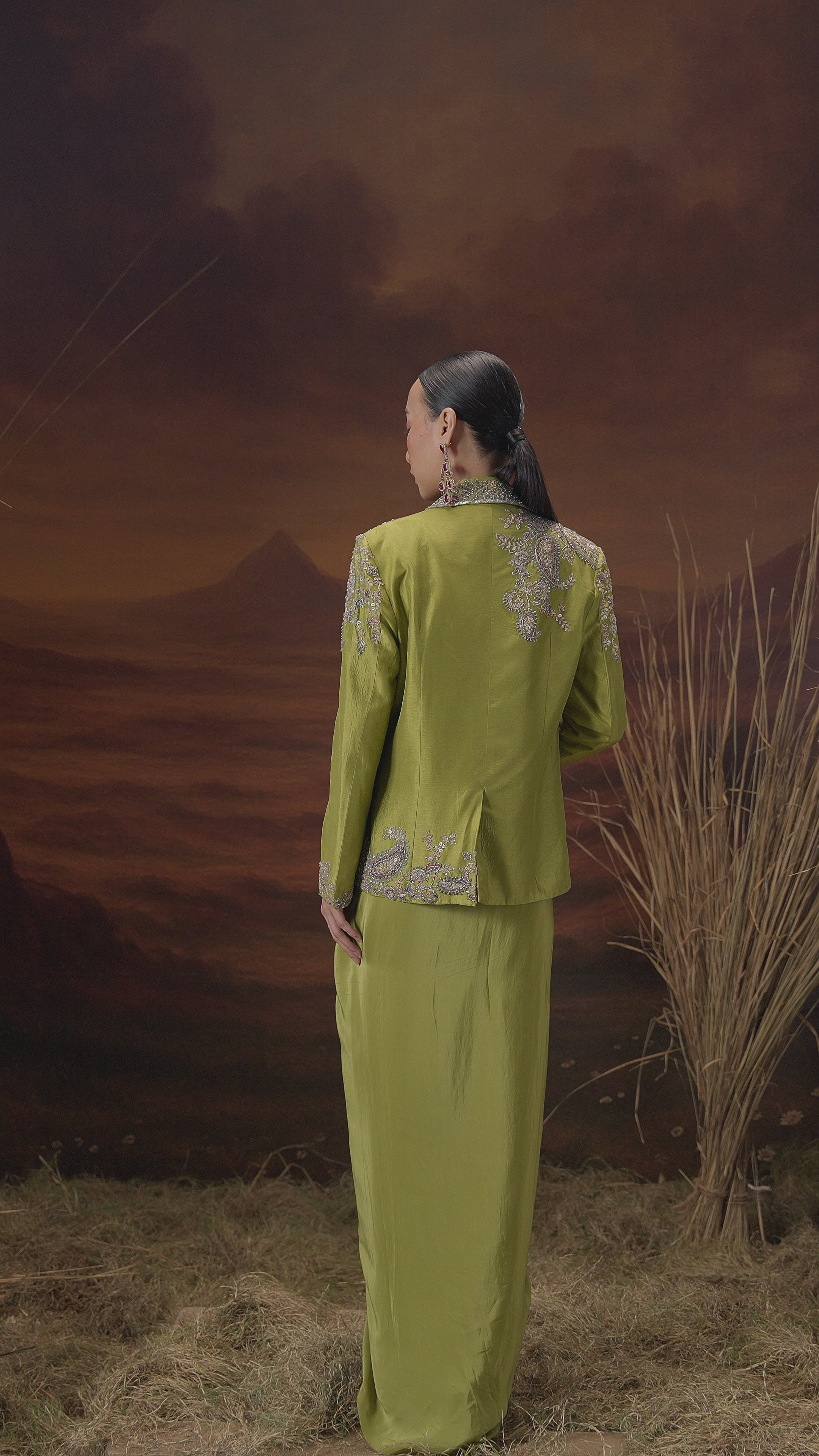 Add a bold statement to your festive wardrobe with this olive green three-piece ensemble — where traditional elegance meets contemporary edge.