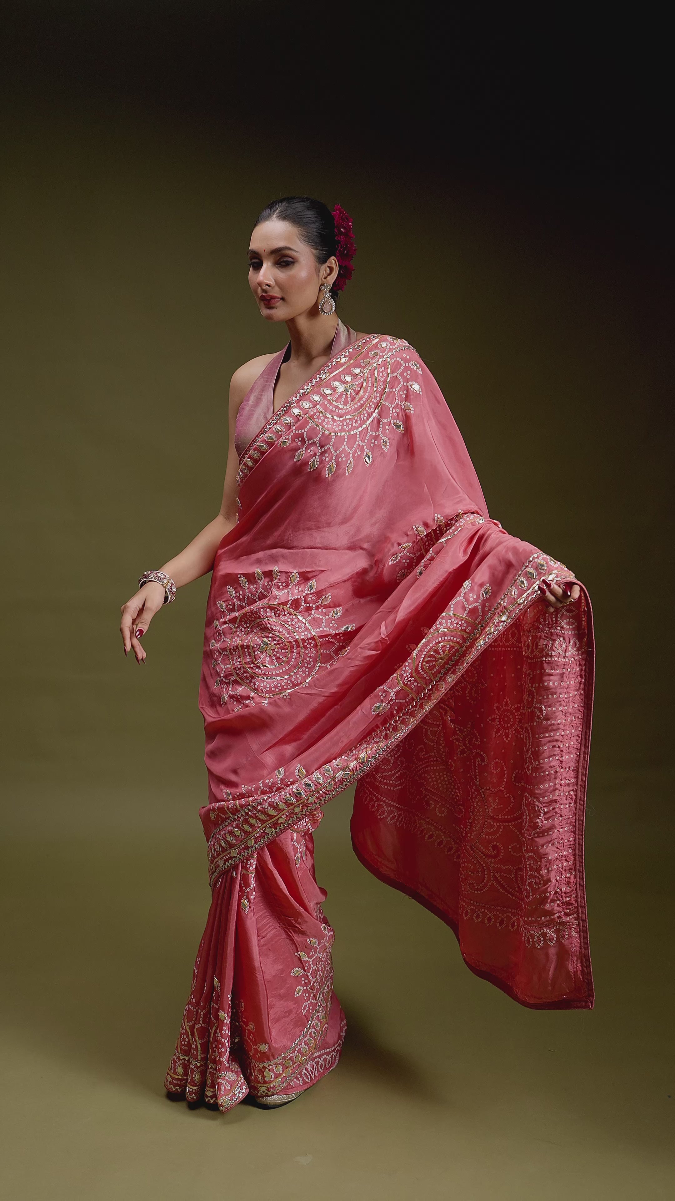 Gracefully feminine and elegant, this Rose blush bandhej printed saree features intricate gotta work and traditional embroidery that radiates regal charm. Crafted on a soft silk-blend fabric, the saree is adorned with detailed embellishments along the borders and pallu, creating a dazzling effect.