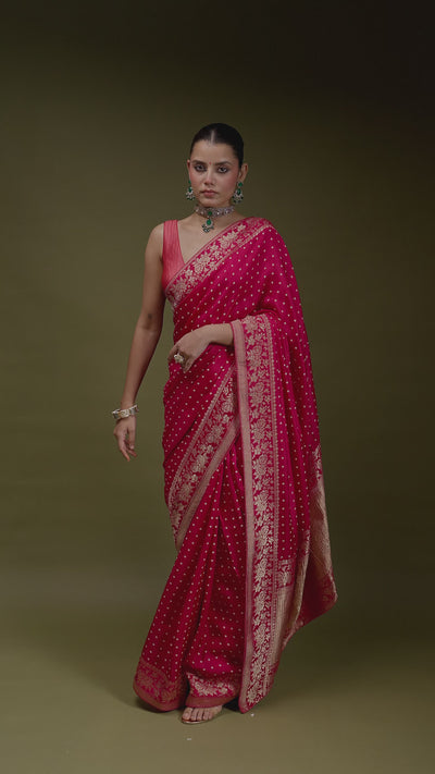 This lively pink bandhej cosmo silk saree showcases pitta and zari detailing along with a chit pallu, making it an ideal choice to brighten up your collection with a touch of joy.