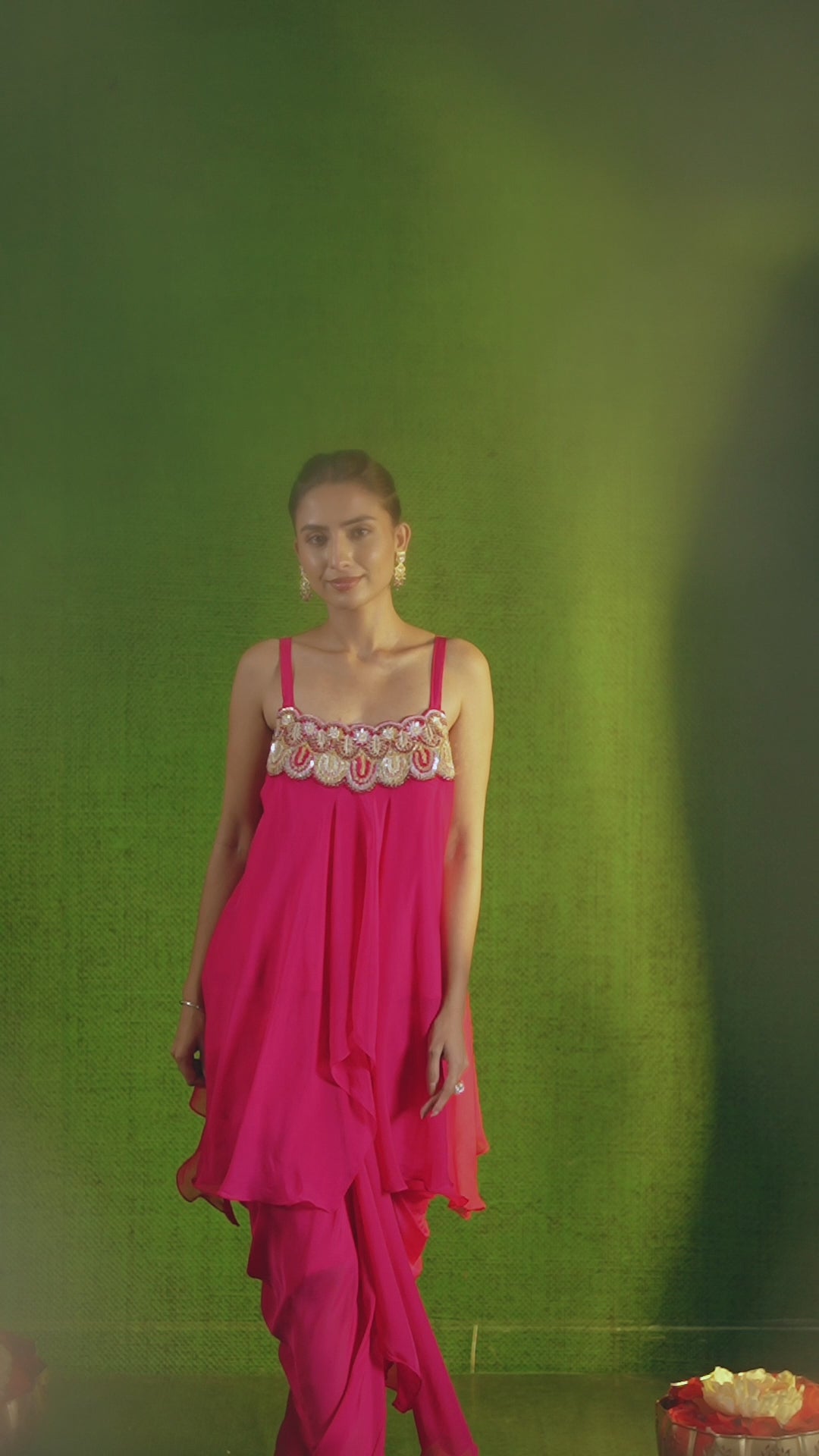 Elevate your style with our Pink Embellished Organza Silk Skirt Set. The asymmetrical tunic, adorned with intricate sequin, cut dana, thread, and bead work, pairs beautifully with a matching solid draped skirt. Ideal for semi-formal events.