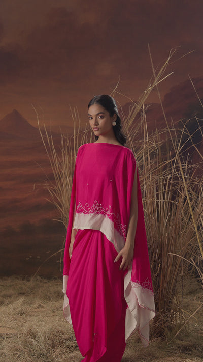 A contemporary raw silk ensemble featuring a draped tie-dye gown paired with an ombré embellished shrug.