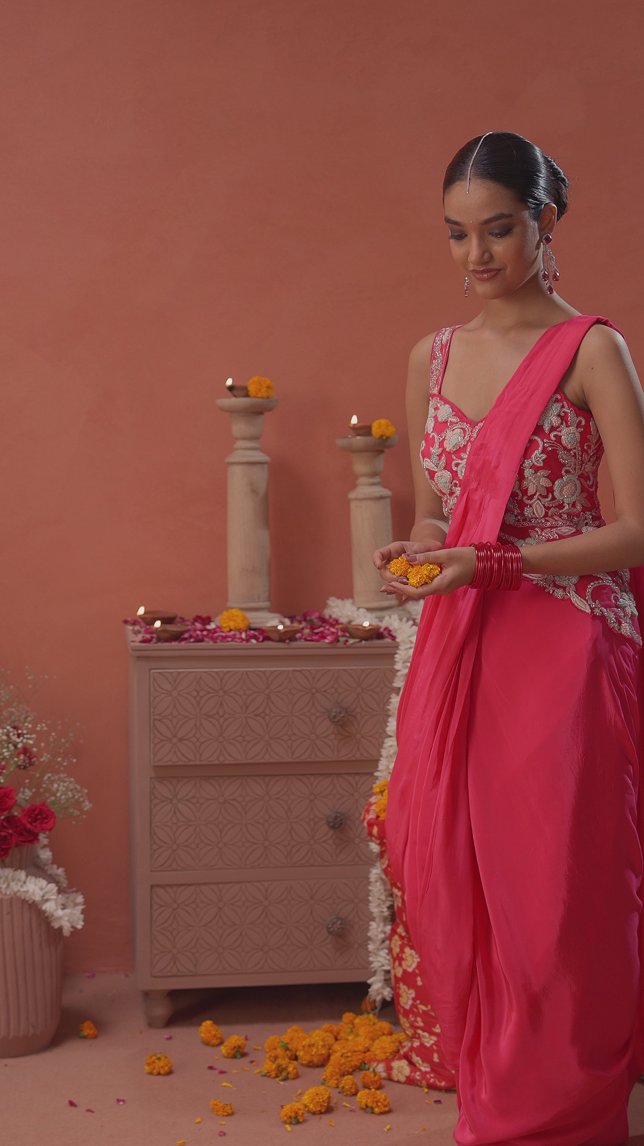 Embrace the festive spirit in this beautiful Hot Pink Satin Silk Draped Saree, paired with a stunning padded blouse featuring intricate handwork.