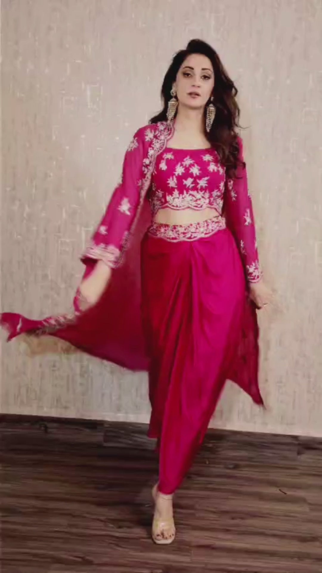 Breeze through celebrations in our fuchsia pink embellished satin silk draped skirt set that reflects festive gleam. This ensemble features a jacket adorned with resham thread hand embroidered work. Paired with matching satin silk crop top and draped skirt with work on border. Perfect for semi-formal occasions. Elevate your ethnic style with this silhouette that exudes elegance.