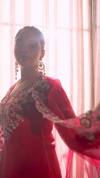 Make a dazzling entrance in this vibrant Bright Pink Skirt Set. This three-piece ensemble features a flowing kurta and beautifully pleated skirt, both crafted from luxurious crepe silk. The outfit is completed by a sheer organza silk cape, with all pieces intricately adorned with heavy handwork, including sequins, zari, beads, and cut dana, creating a magnificent and layered silhouette.
