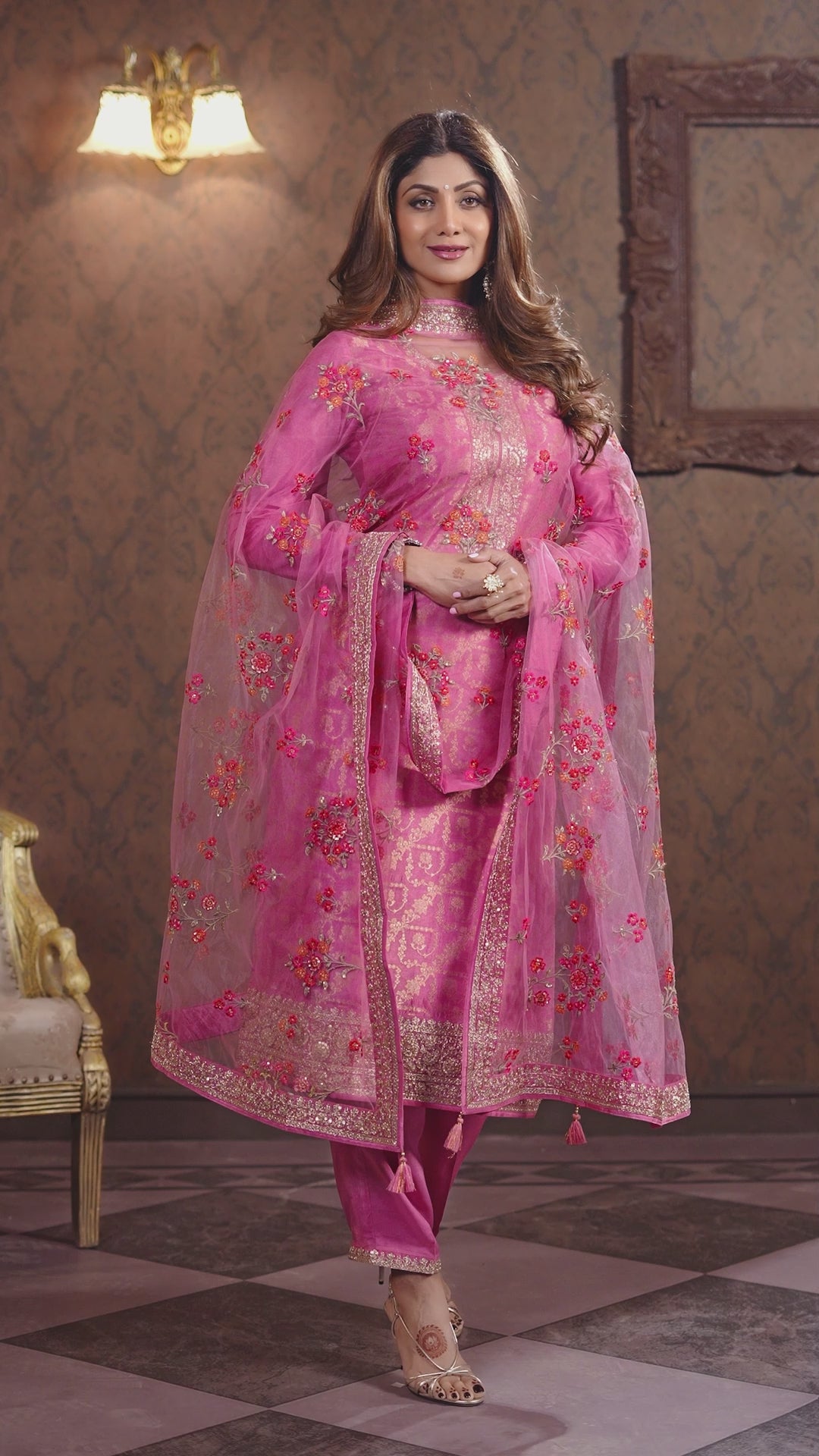Pink Embroidered Banarasi Organza Silk Pants Set