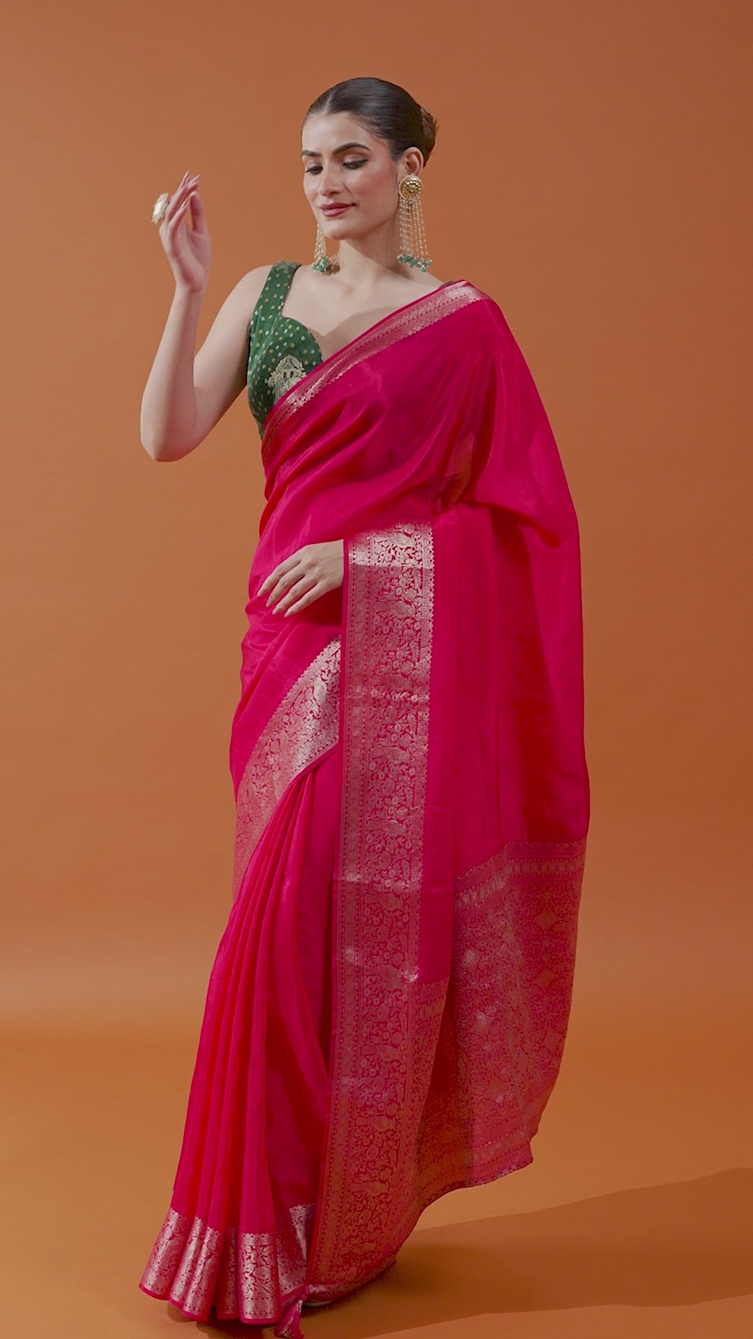 Experience the timeless elegance of this cosmo silk saree in a beautiful pink color. Its delicate fabric boasts a glistening brocade embroidery that captures and reflects light, adding a touch of enchantment to any occasion. Perfect for upscale weddings, evening receptions, and cocktail parties, this saree comes with a deep green bandhej printed blouse and gracefully drapes over your natural curves.