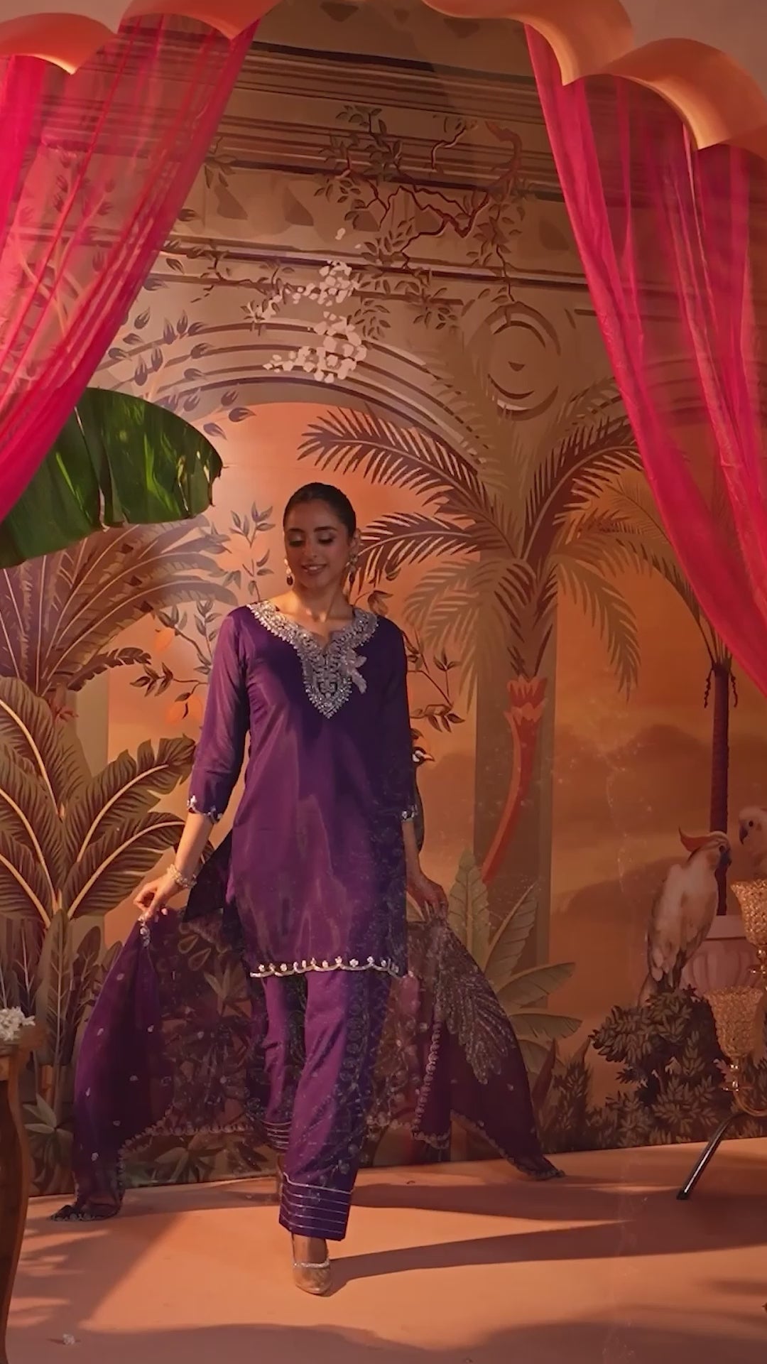 Exude timeless elegance in this vibrant Vivid Violet Pant Set. This three-piece ensemble features a crepe silk kurta and pant, beautifully tailored and enhanced with intricate silver zari, threadwork, and cut dana along the hems. A sheer organza silk dupatta with matching lace embellishment completes this sophisticated and regal look.
