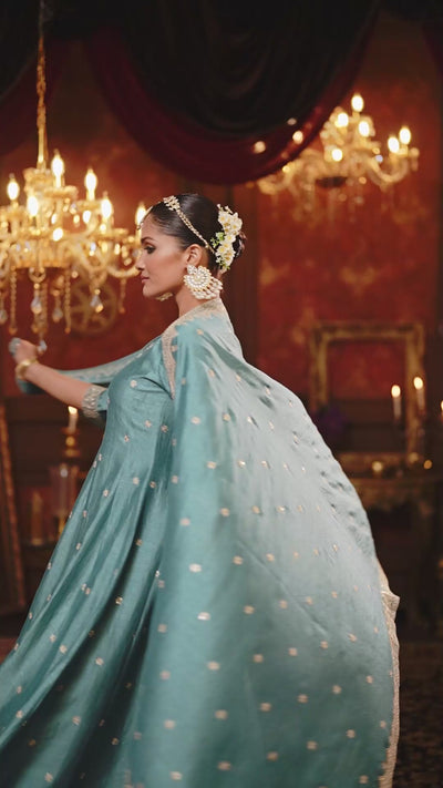 A captivating three-piece set crafted from luxurious Premium Silk, featuring a beautifully flared, frock-style kurta. The soothing kurta is adorned with delicate scatter motifs and intricate golden hand-embroidery on the yoke, pant, and dupatta borders for an opulent finish.