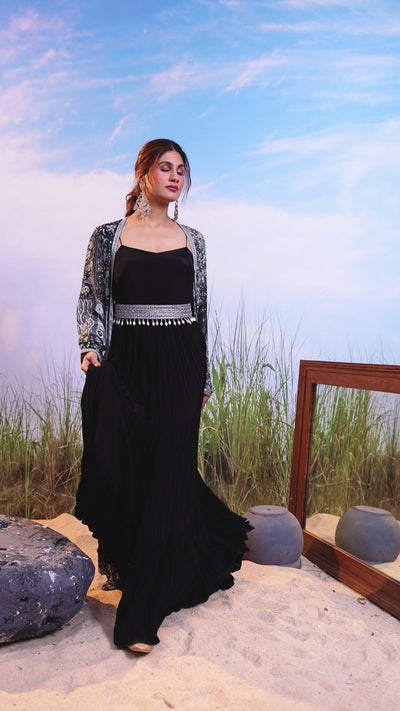 This stunning three-piece set is designed for dramatic flair, combining a bold, single-color inner gown with a vibrant, heavily patterned outer jacket. The set includes a sleeveless Tiered Gown, a decorative Belt with beadwork, and a long Shrug/Jacket featuring patchwork-style print and hand-embellishment.