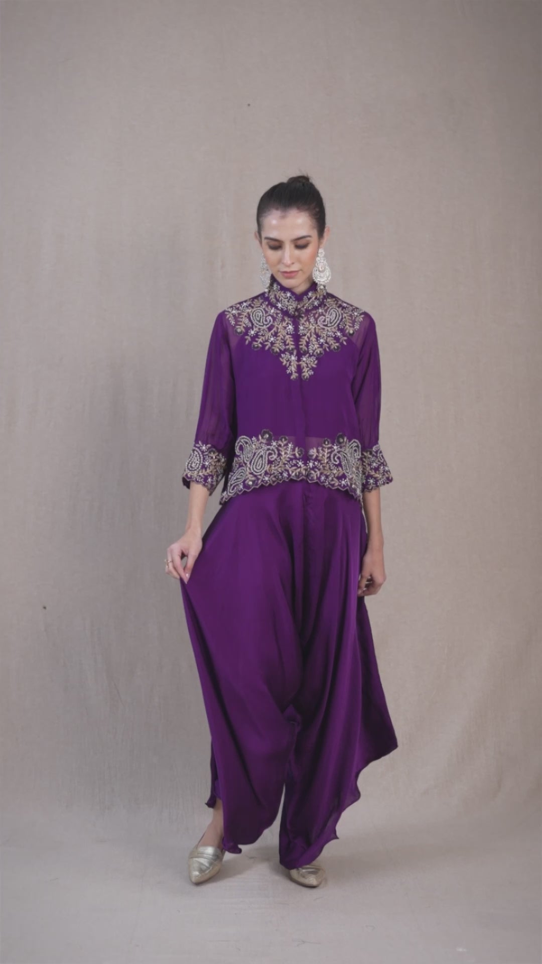 Introducing our Purple Organza Silk Jacket & Palazzo Set. The set features an organza silk jacket with intricate sequin, zari, bead, and cut dana handwork. It comes with a matching satin silk crop top and an asymmetrical palazzo. Perfect for semi-formal wear.