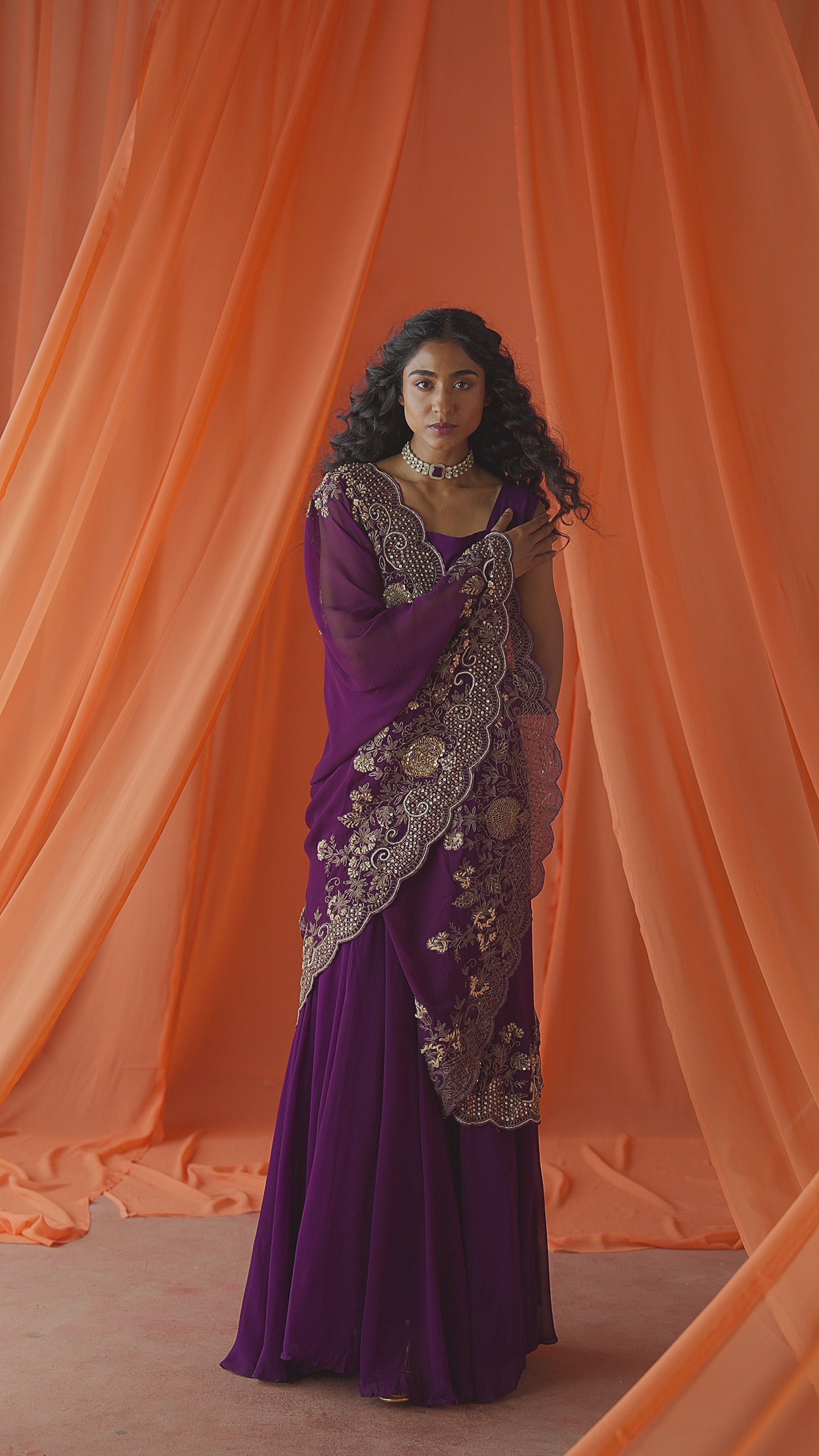 A striking asymmetric gown with a square neckline, paired with a draped pounchu. Finished with detailed embroidery along the borders for a refined festive look.