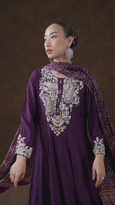 Embrace timeless grandeur in this opulent Plum Purple Anarkali Set. This three-piece ensemble features a flowing raw silk kurta with a spectacular, heavily hand-embellished yoke adorned with intricate paisley motifs, sequins, beads, and cut dana work. The look is completed with matching raw silk pants and a smooth satin silk dupatta featuring a beautiful, traditional Bandhini print.