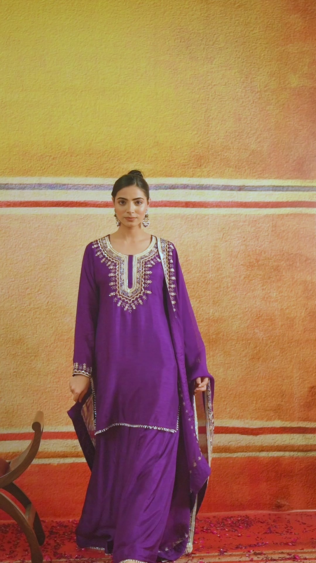 Introducing our Purple embellished Raw silk kurta. Crafted with intricate sequin, bead, zari and cut dana handwork. Paired with matching palazzo and an organza silk dupatta. Apt for semi formal wear.