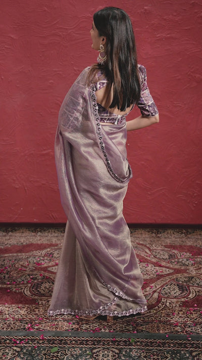 This vibrant two-piece ensembles a Tissue Silk Saree showcasing a modern embellished & embroidery in a vibrant shade of purple. An elegant saree detailed with thread work with Sequins and Pearl work. It is paired with a matching beautiful Rangkat embroidery blouse with some sequin work, complimenting the saree's ornate borders.