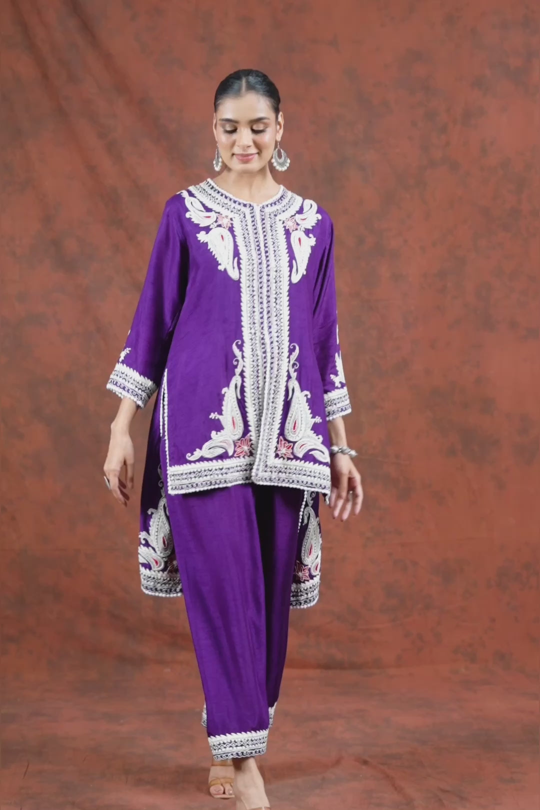 Dark Purple Ethnic Hand embroidered Asymmetrical Tunic with minimal embellishments, crafted with multi slit detailings all over. Teamed with matching embroidered palazzo pants to complete the look. Apt for semi formal wear.