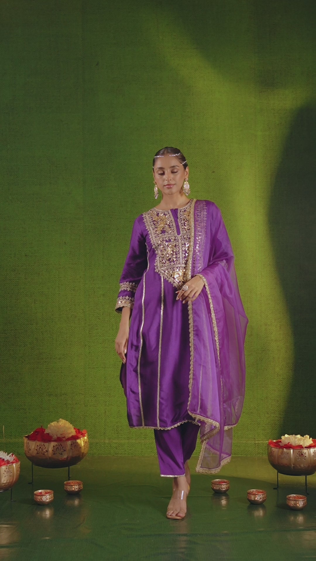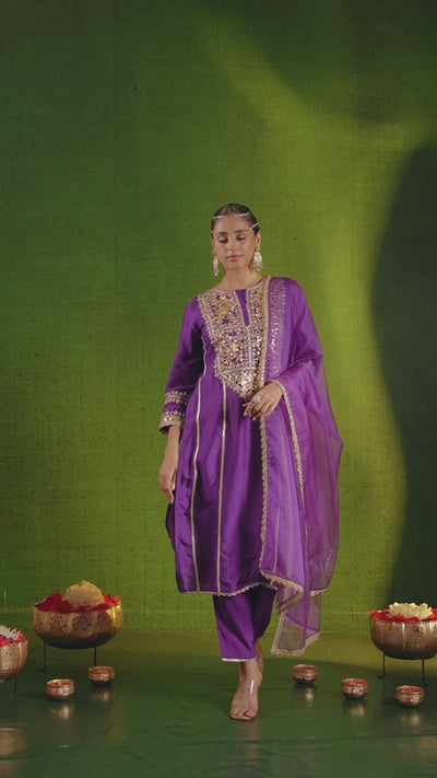 Introducing our stunning Purple Embroidered German Silk Pants Set. This elegant ensemble features a beautifully crafted kurta adorned with intricate gotta handwork, paired perfectly with matching pants. The look is completed with a luxurious organza silk dupatta, making it ideal for semi-formal occasions.