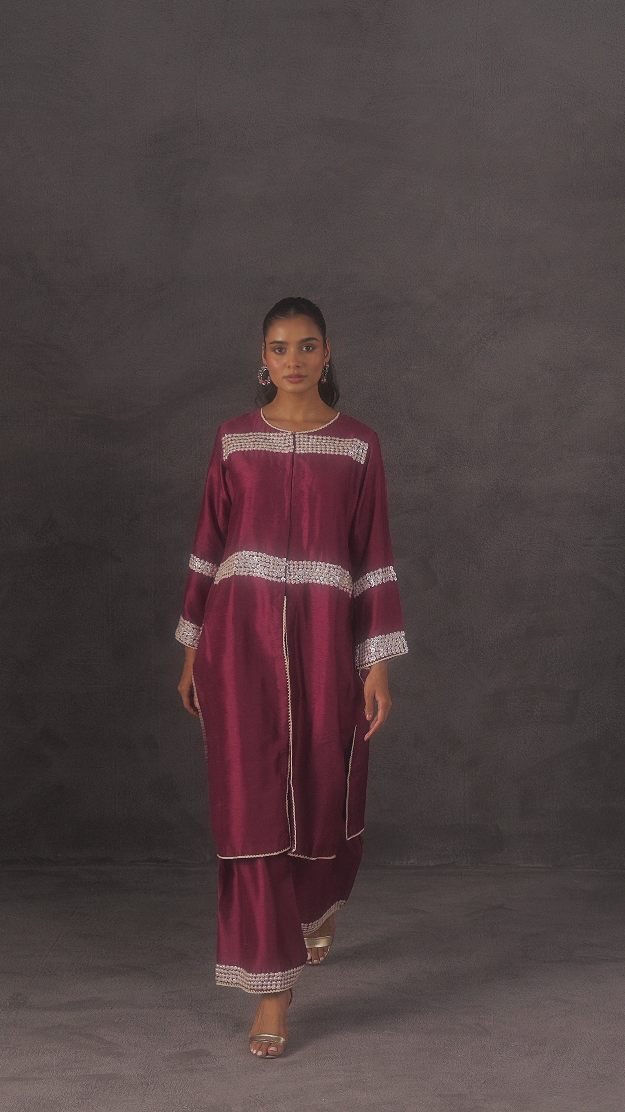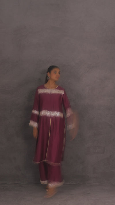This elegant kurta and pant set is crafted from luxurious raw silk fabric, exuding a rich and refined charm. The purple pink ensemble is adorned with intricate silver floral embroidery, adding a delicate yet striking contrast. The kurta features horizontal embroidered panels across the chest, sleeves, and hemline, while the wide-legged pants mirror the design with matching detailing at the cuffs. Finished with a front slit and minimalistic neckline, this outfit effortlessly combines tradition with contemporary grace. Ideal for festive occasions or evening gatherings.