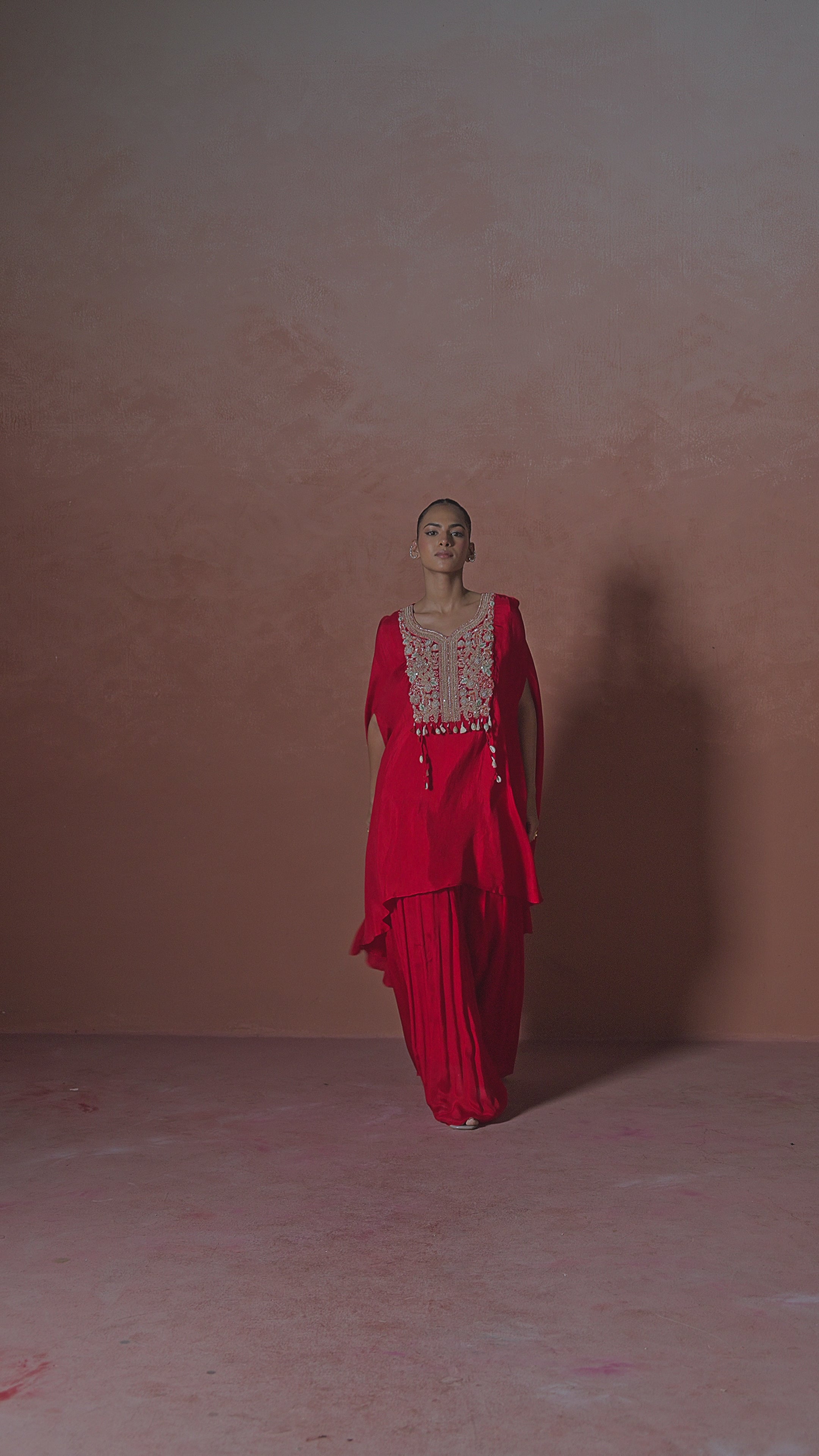 Red Embellished Kurta paired with Chinon Silk Palazzo and solid colored inner.