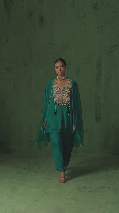 Teal Green embellished Kurta paired with Chinon Silk Palazzo and Dupatta.