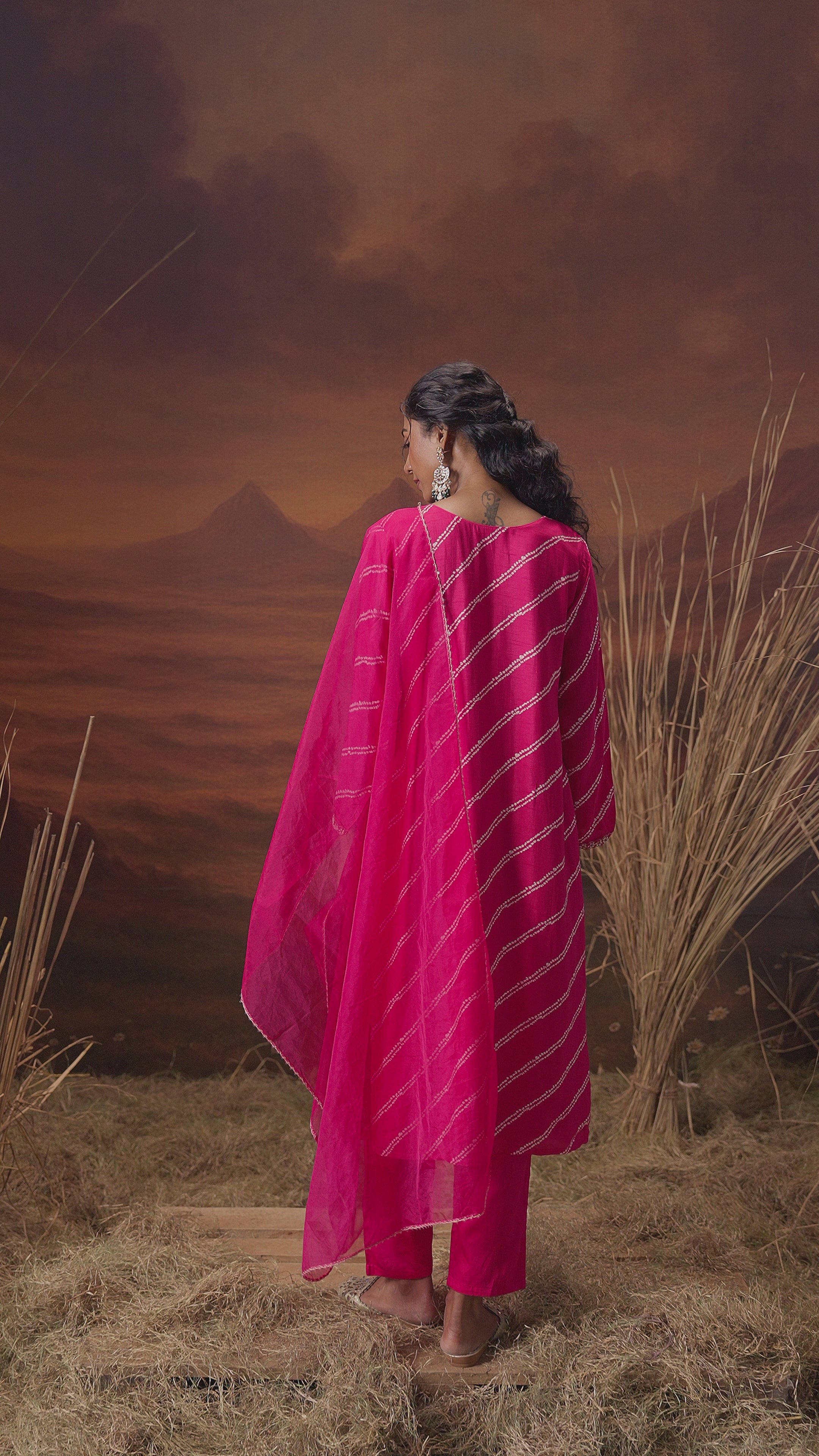 Fuchsia Pink Embellished Raw Silk Pant Set