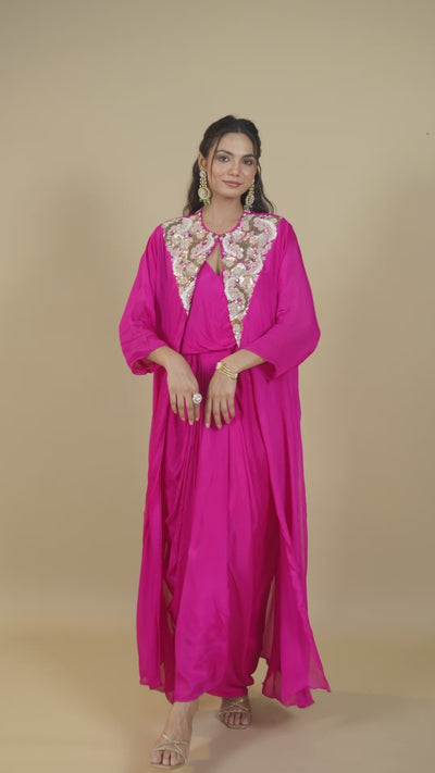 Rani pink embellished premium chinon silk cape. Crafted with sequin, bead, zari and aari taari handwork embroidery. Paired with a matching solid gown. Apt for semi formal wear.