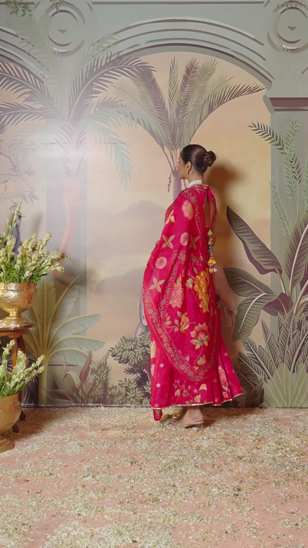 This gorgeous deep pink Anarkali set features a cut-sleeve kurta with exquisite zari, beads, and cut dana, floral print. The grand look is completed by a complementing printed dupatta, making it perfect for any festive occasion.