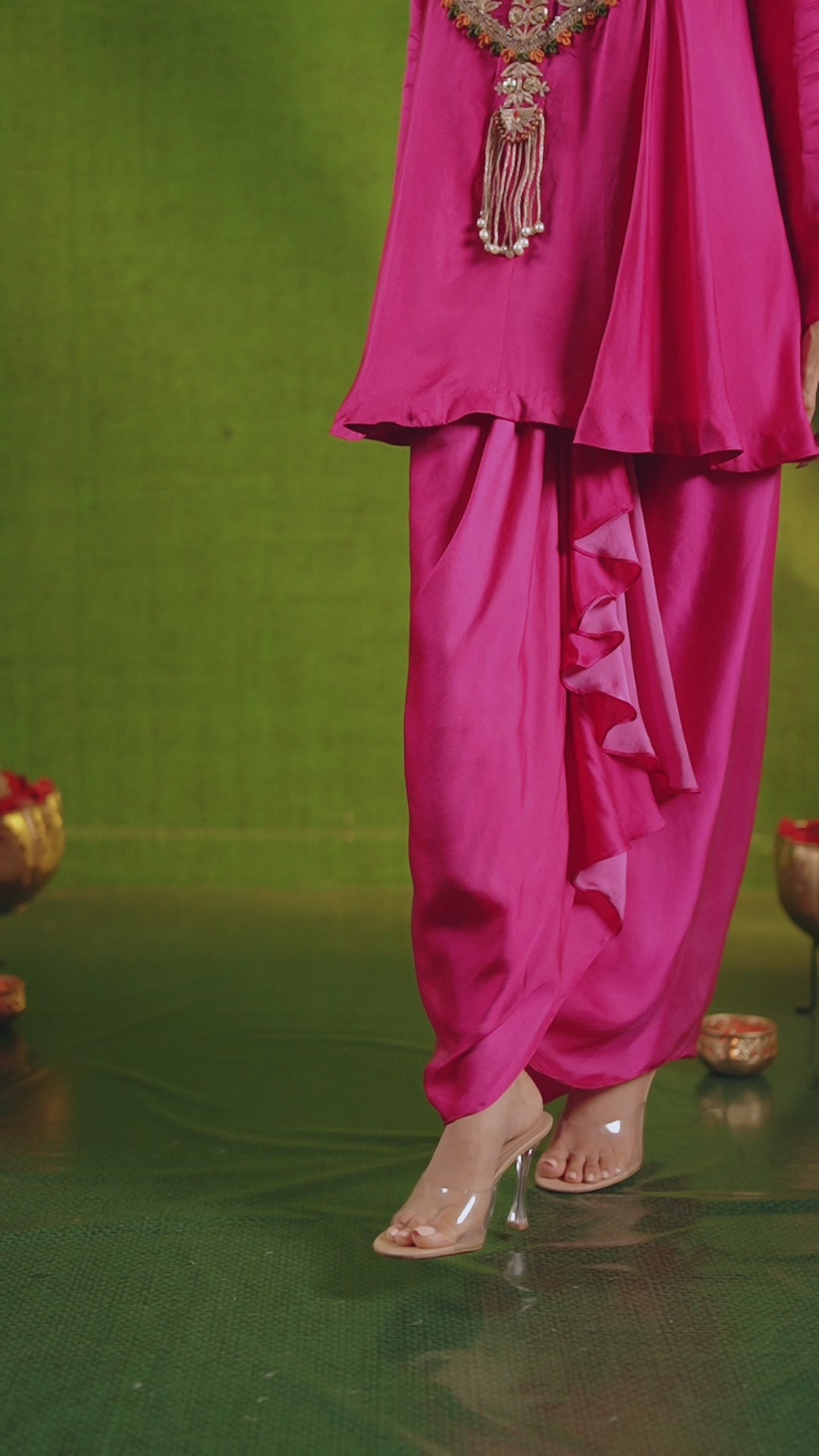 Step into elegance with our stunning Rani Pink Embellished Satin Silk Tunic and Skirt. The tunic is handcrafted with intricate work of sequin, bead, zari, aari tari and thread embroidery. Paired with matching ombre-dyed satin silk drape skirt. This look is epitome of grace and lively fashion. Perfect for semi-formal wear.