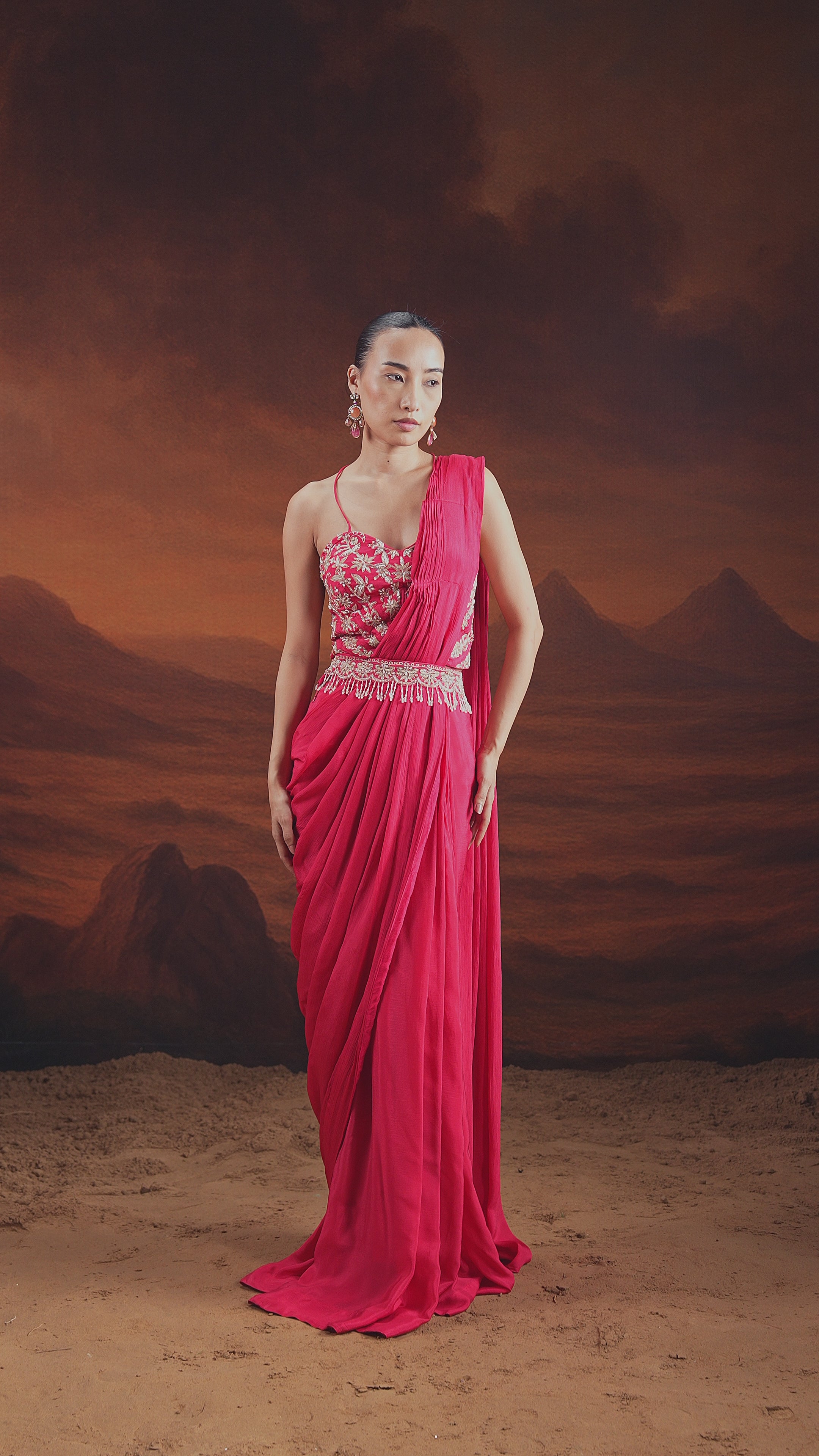 Raspberry Pink Embellished Chinon Silk Draped Saree