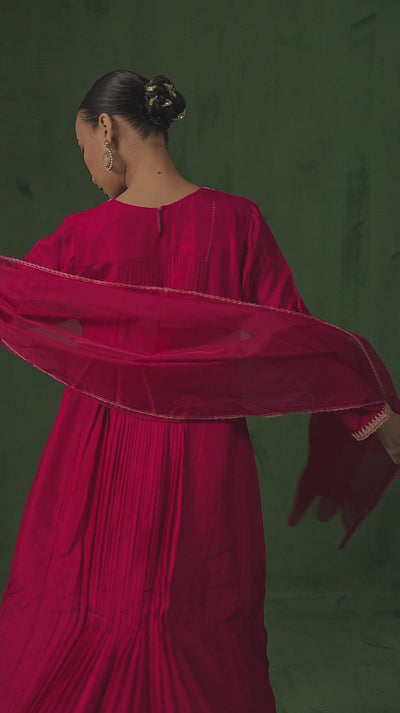 This elegant raspberry pink 3-piece set includes a pleated raw silk kurta, solid palazzo pants, and an organza dupatta.