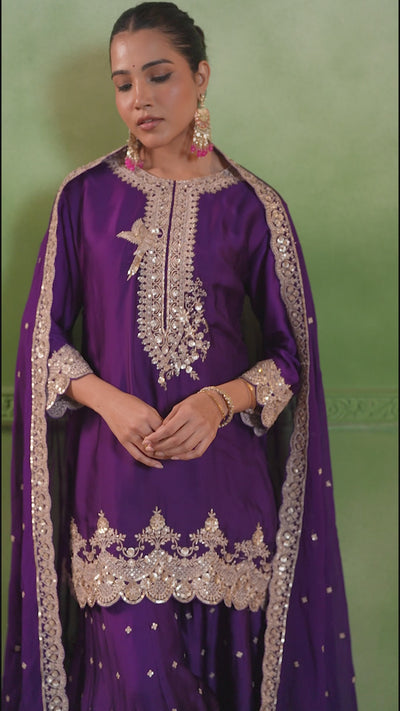 This luxurious Plum Purple set features an elegantly embellished kurta and palazzo combination. The ensemble is completed by a matching dupatta with an exceptionally heavy, intricate border and overall embellishment, creating a dazzling and festive look.