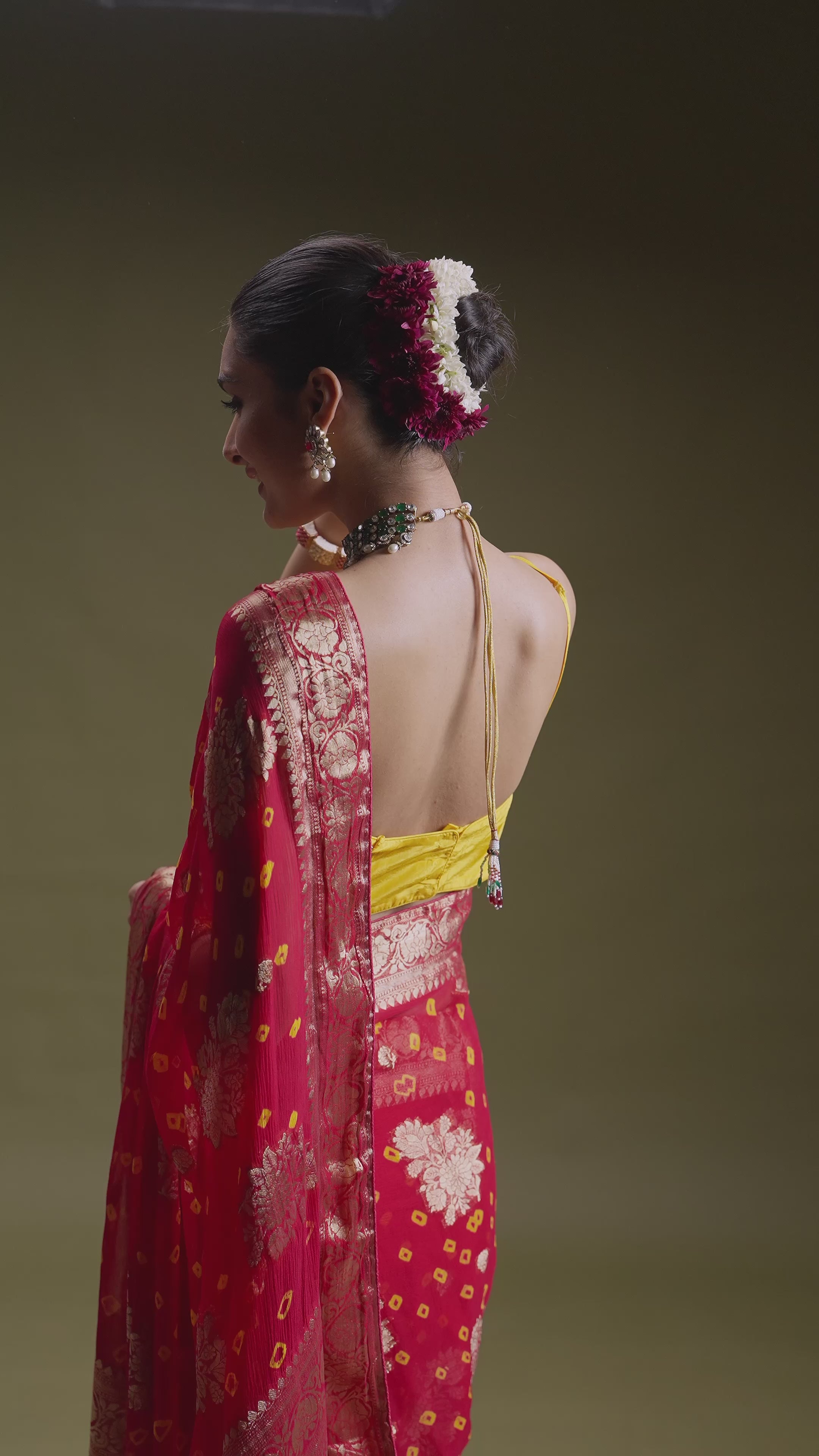 Wrap yourself in royal elegance with our Red Bandhej Dola Silk Saree a delightful tribute to age-old artistry. This vibrant red saree dazzles with detailed golden zari accents and charming bandhej-style designs on the body and pallu. Perfect for the queen who loves a touch of tradition with a playful twist.