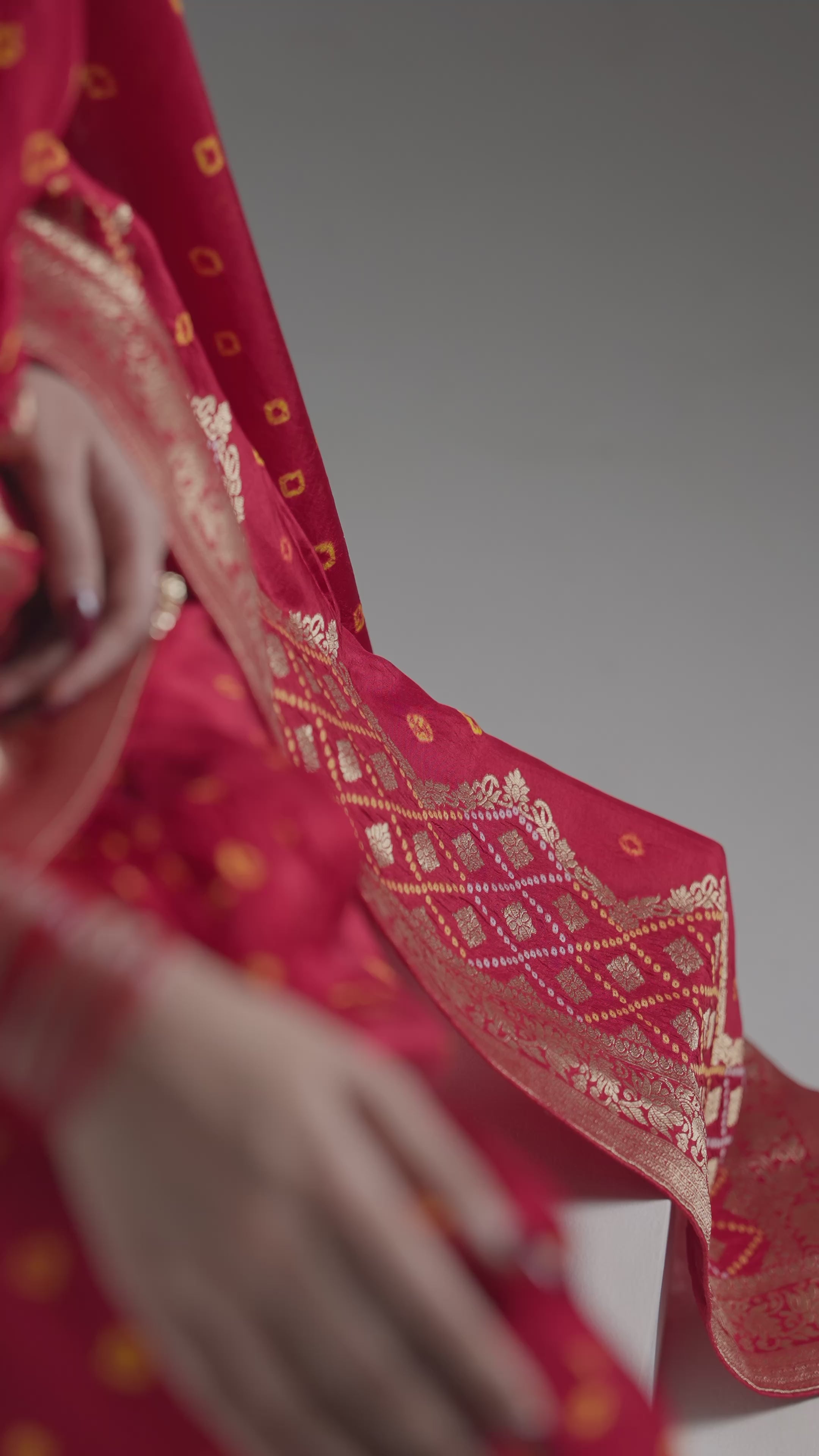 Wrap yourself in royal elegance with our Red Bandhej Premium Silk Saree, a delightful tribute to age-old artistry. This vibrant red saree dazzles with detailed golden zari accents and charming bandhej-style designs on the body and pallu. Perfect for the queen who loves a touch of tradition with a playful twist.