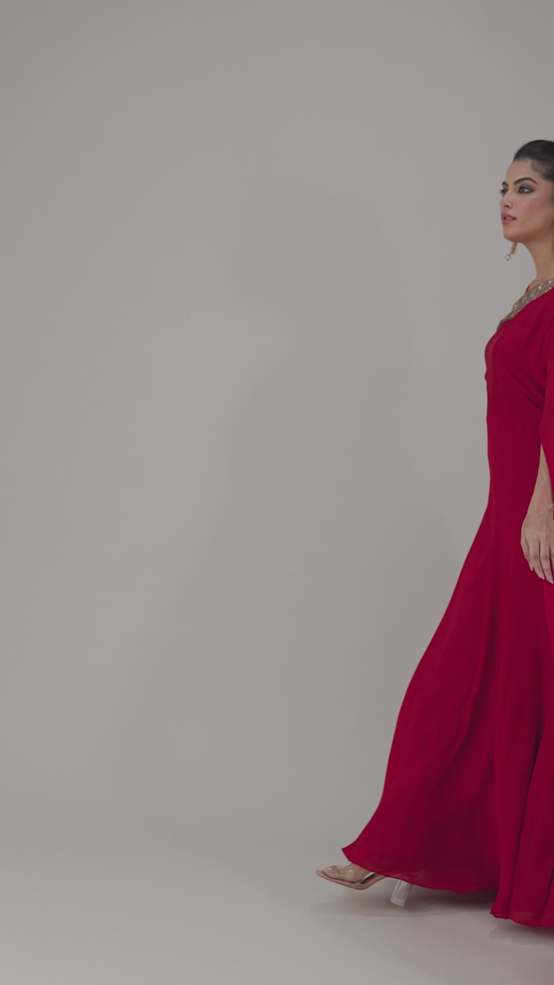 Introducing our Red Embellished Chinon Silk Gown, a captivating creation that combines timeless elegance with intricate craftsmanship. The gown is beautifully adorned with delicate sequin, zari, and aari handwork, adding depth and texture to the rich red fabric. Styled with flare sleeves for a graceful and fluid silhouette, this piece is perfect for semi-formal occasions.