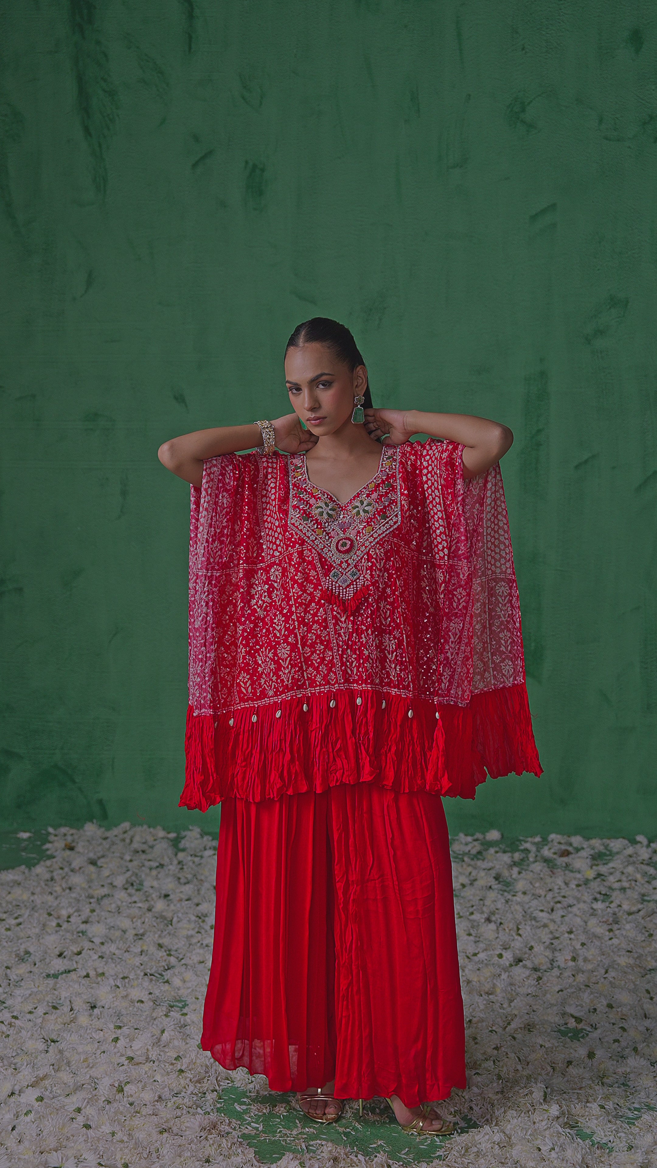 Red embellished kurta. Paired with Raw Silk Palazzo and Solid Colored Inner .