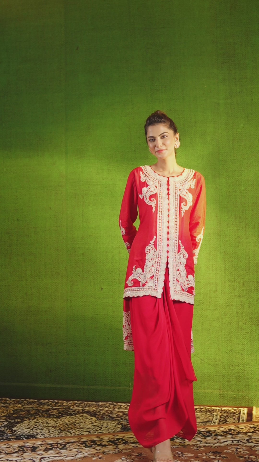 Introducing our exclusively tailored red embellished raw silk jacket drape skirt set. High low jacket features sequin, bead, cut-dana and thread work. It is paired with matching solid chinon silk drape skirt. Add grace to your persona.