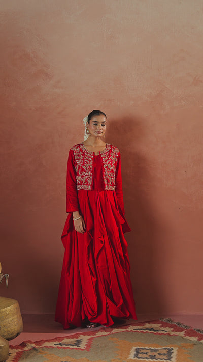 Exude breathtaking elegance in this magnificent Hot Red Gown Set. This two-piece ensemble features a flowing raw silk gown with a beautifully draped, layered skirt. The look is completed by a cropped jacket that is a masterpiece of handwork, fully covered in intricate gold-toned zari, zardozi, sequins, and beadwork, creating a stunning contrast against the deep blue base.