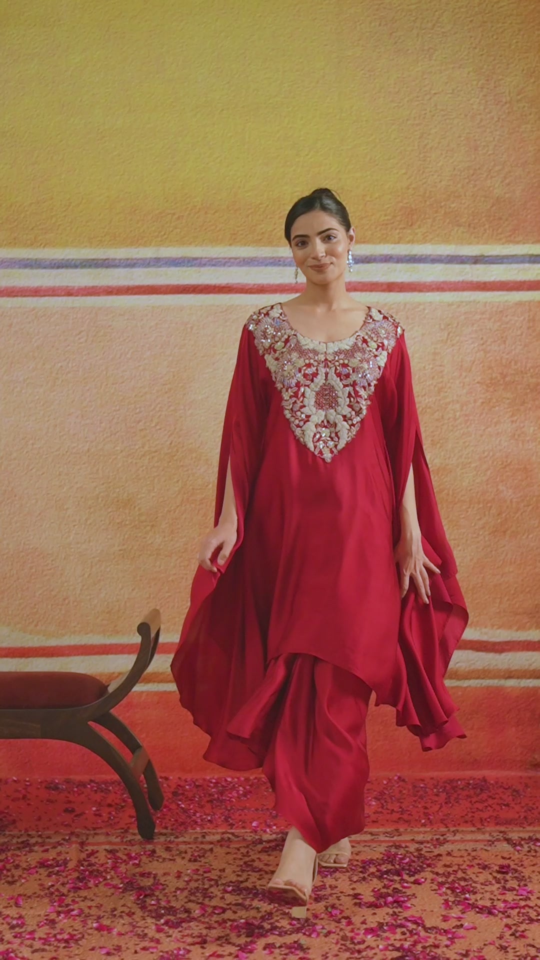 Introducing our Red embroidered Satin silk kaftan. Expertly crafted with intricate sequin, bead, zari and gota handwork. Paired with matching asymmetrical draped skirt. Apt for semi formal wear.
