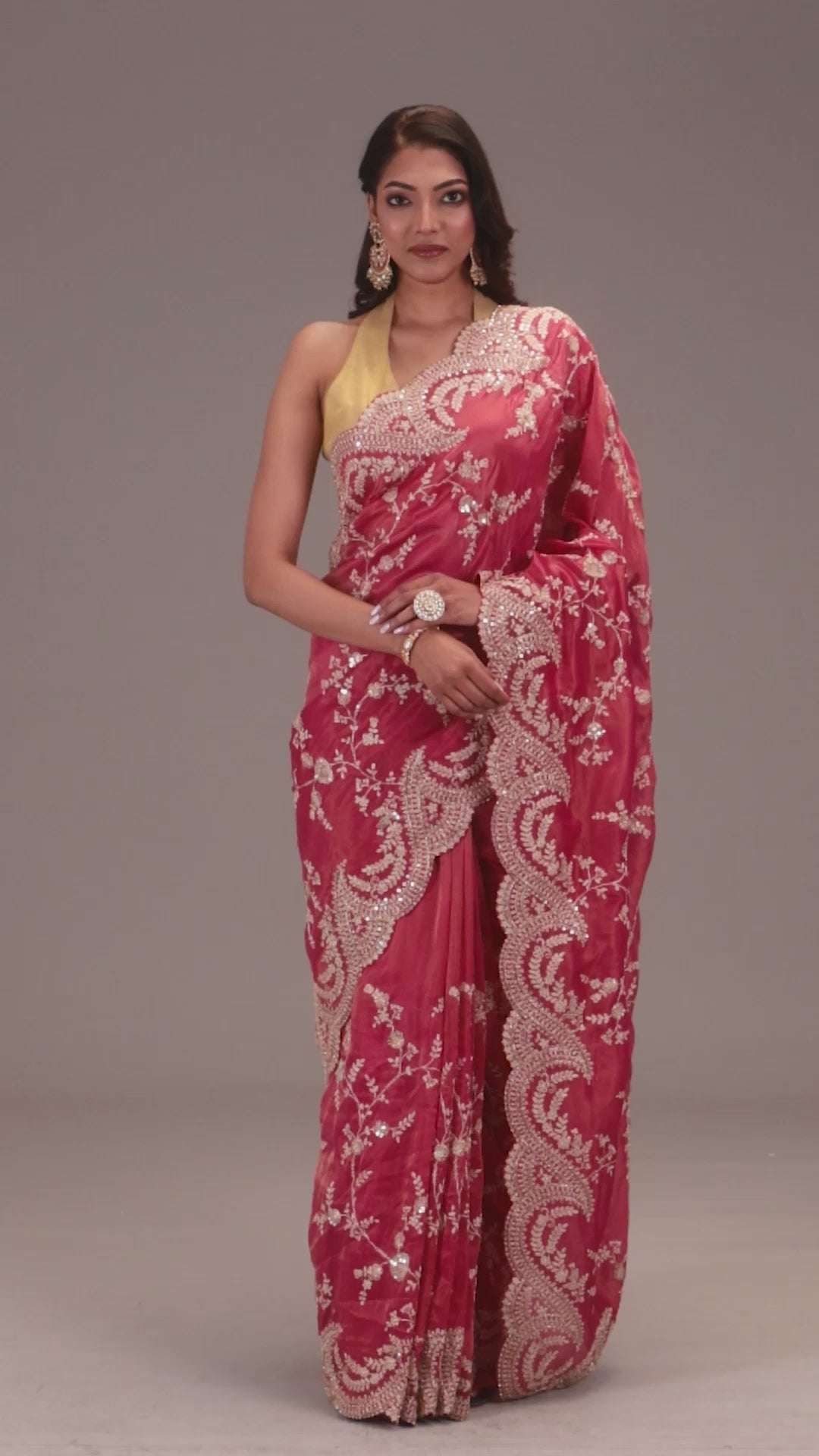 This exquisite saree features a delicate Tissue cosmo fabric adorned with golden aari thread handwork. Its subtle shine captures and reflects light, making it a stunning choice for any special event. The coordinating blouse adds a feminine touch, making it ideal for sophisticated weddings, evening receptions, and cocktail parties. The translucent fabric drapes gracefully, accentuating your natural curves and evoking timeless elegance.