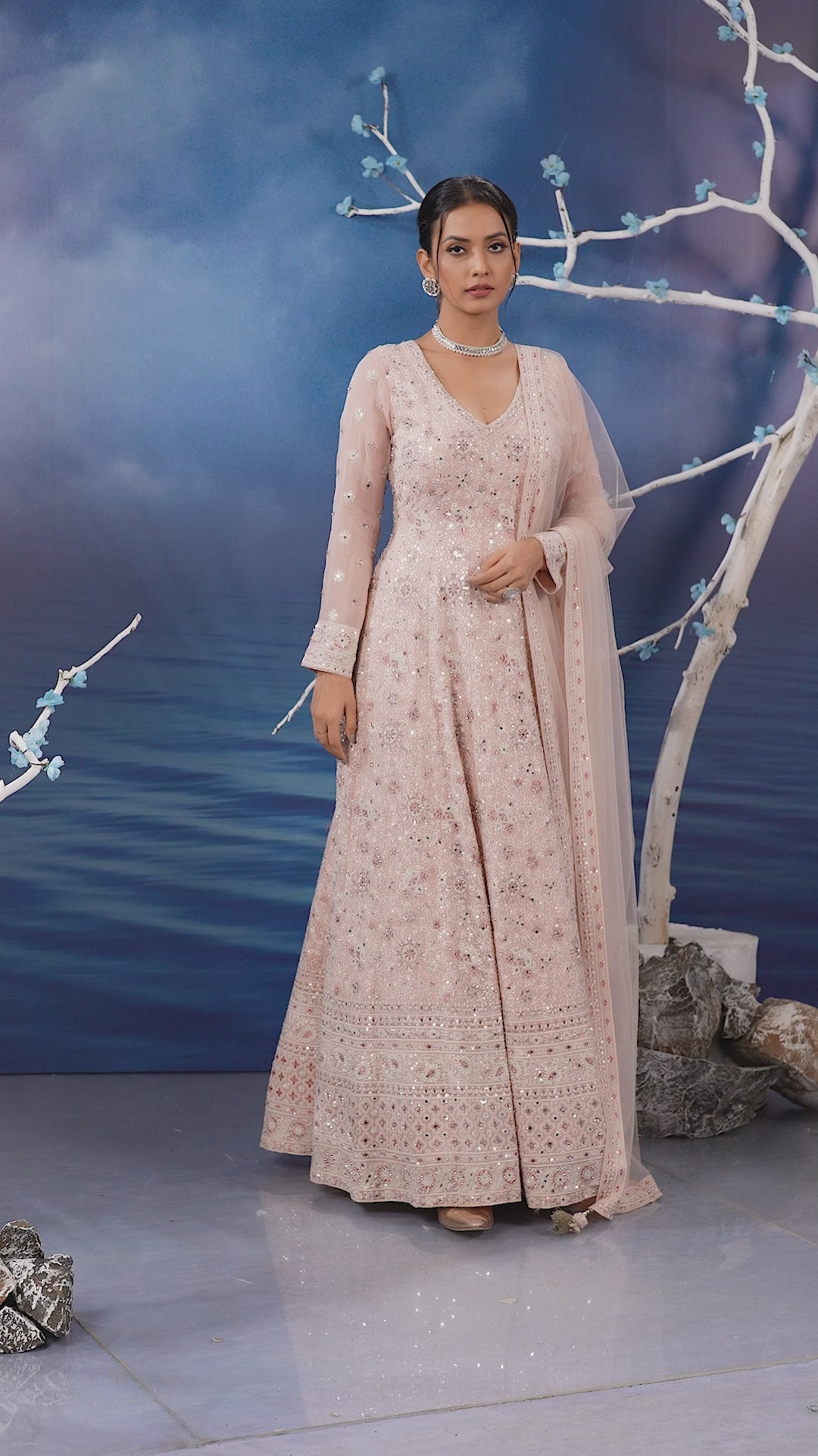 Make a spellbinding statement with our pastel peach heavily embellished italian silk flared gown. This gown is adorned with an exquisite and intricate work of sequins, mirror and resham thread embroidered that exhibits the true work of craftsmanship. Complemented by a matching premium net silk dupatta with embellished lace border and tassels. This alluring outfit exudes elegance and sophistication. Perfect for semi-formal occasions.