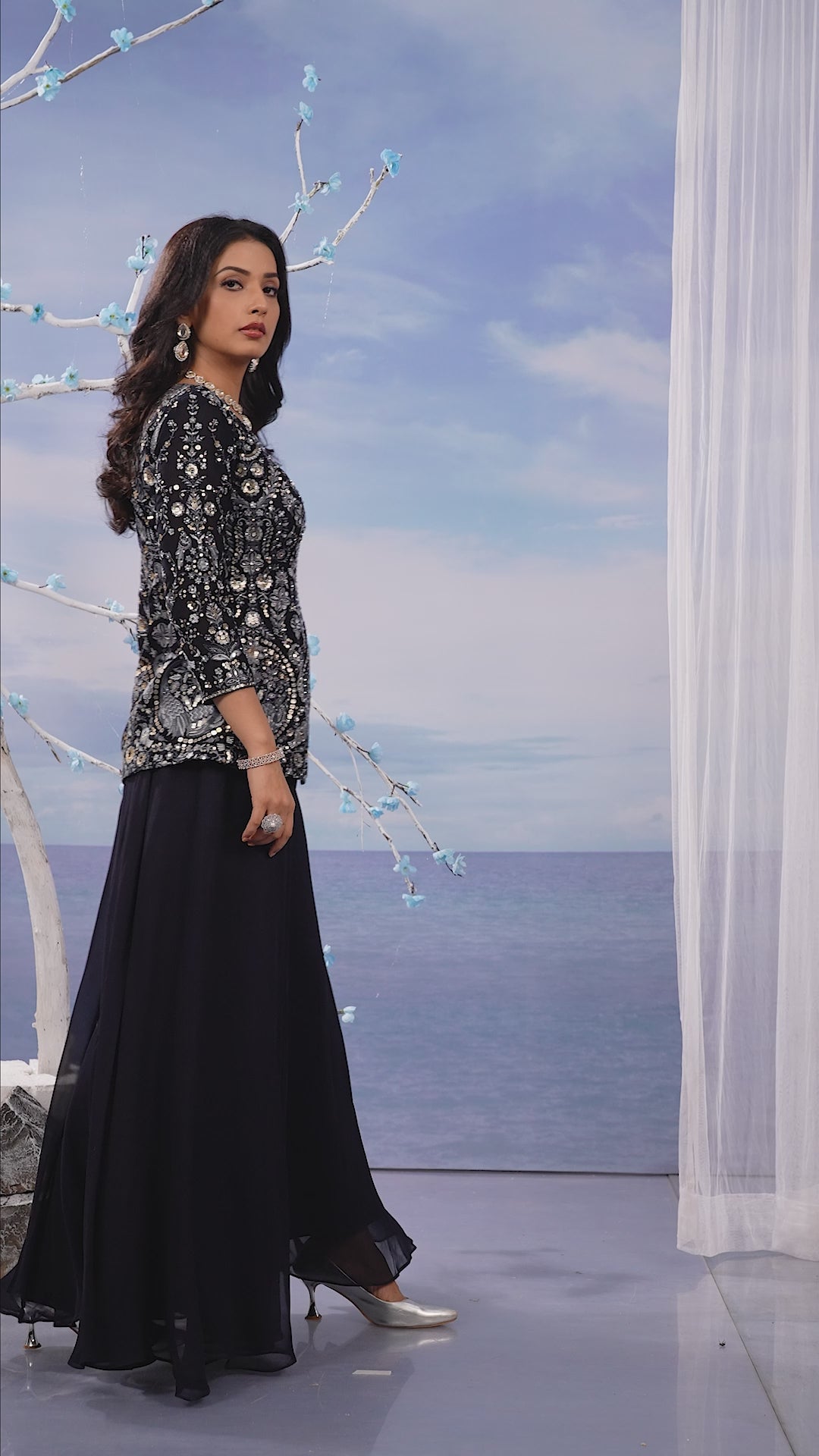 Step into elegance with our classic black embellished premium silk tunic with slits and intricate work of floral embroidery, mirror and sequins. Paired with a matching georgette silk solid palazzo pants. This floral ensemble is crafted to add just the right touch of grace and glam to your festive look and for semi-formal occasions.