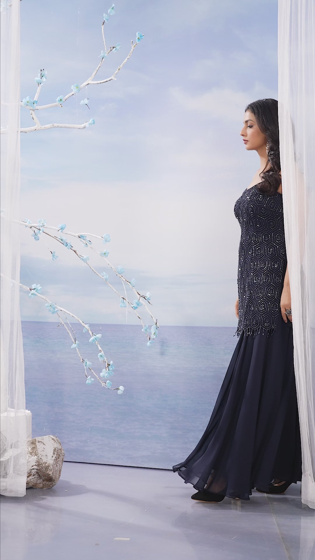 Deep Blue Embellished Georgette Silk Tunic Palazzo Set