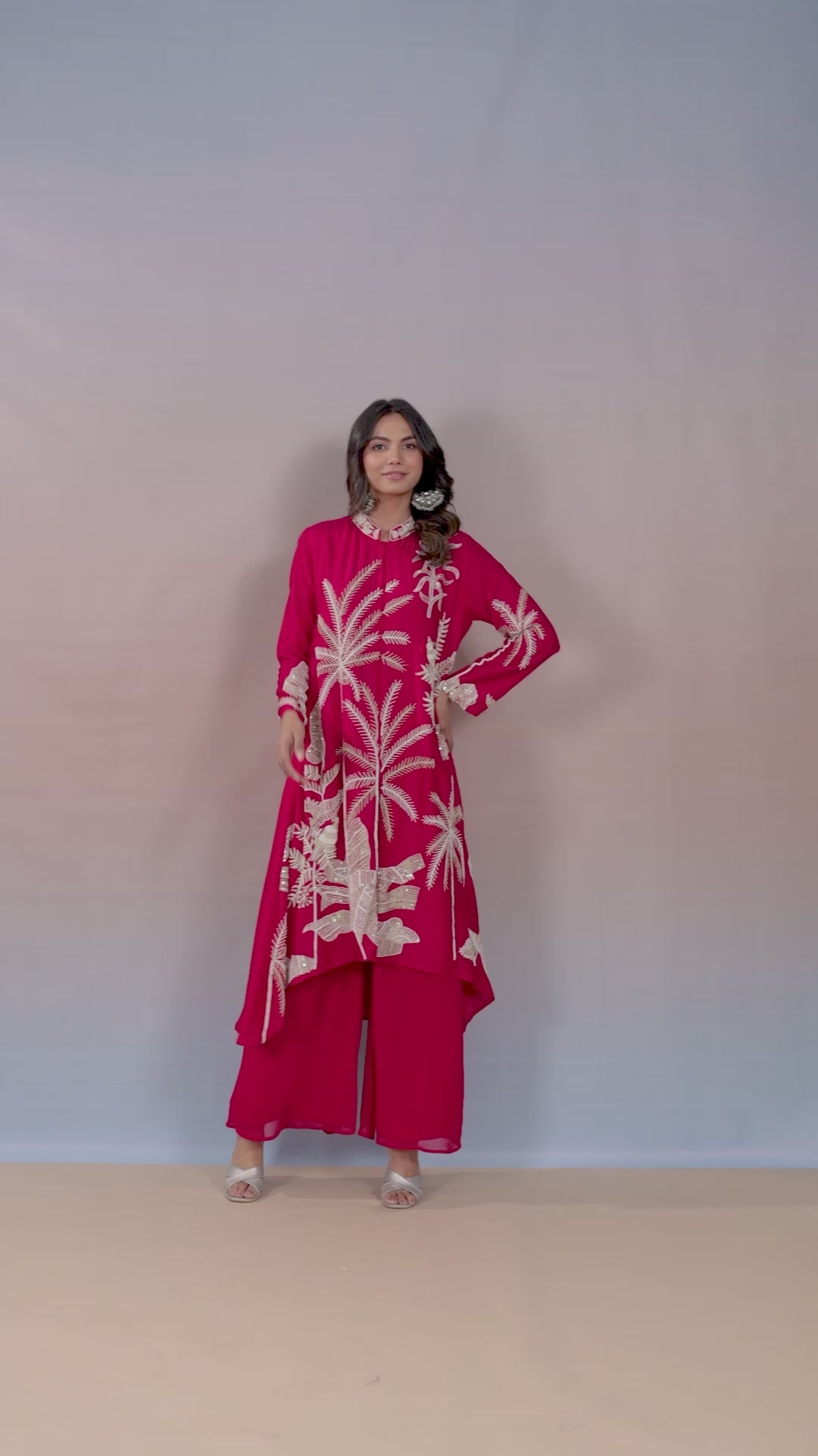 Reddish pink embroidered premium silk asymmetrical kurta with front opening. Crafted with intrinsic sequin and beads handwork embroidery. Paired with matching premium georgette silk flared palazzo. Apt for semi formal wear.