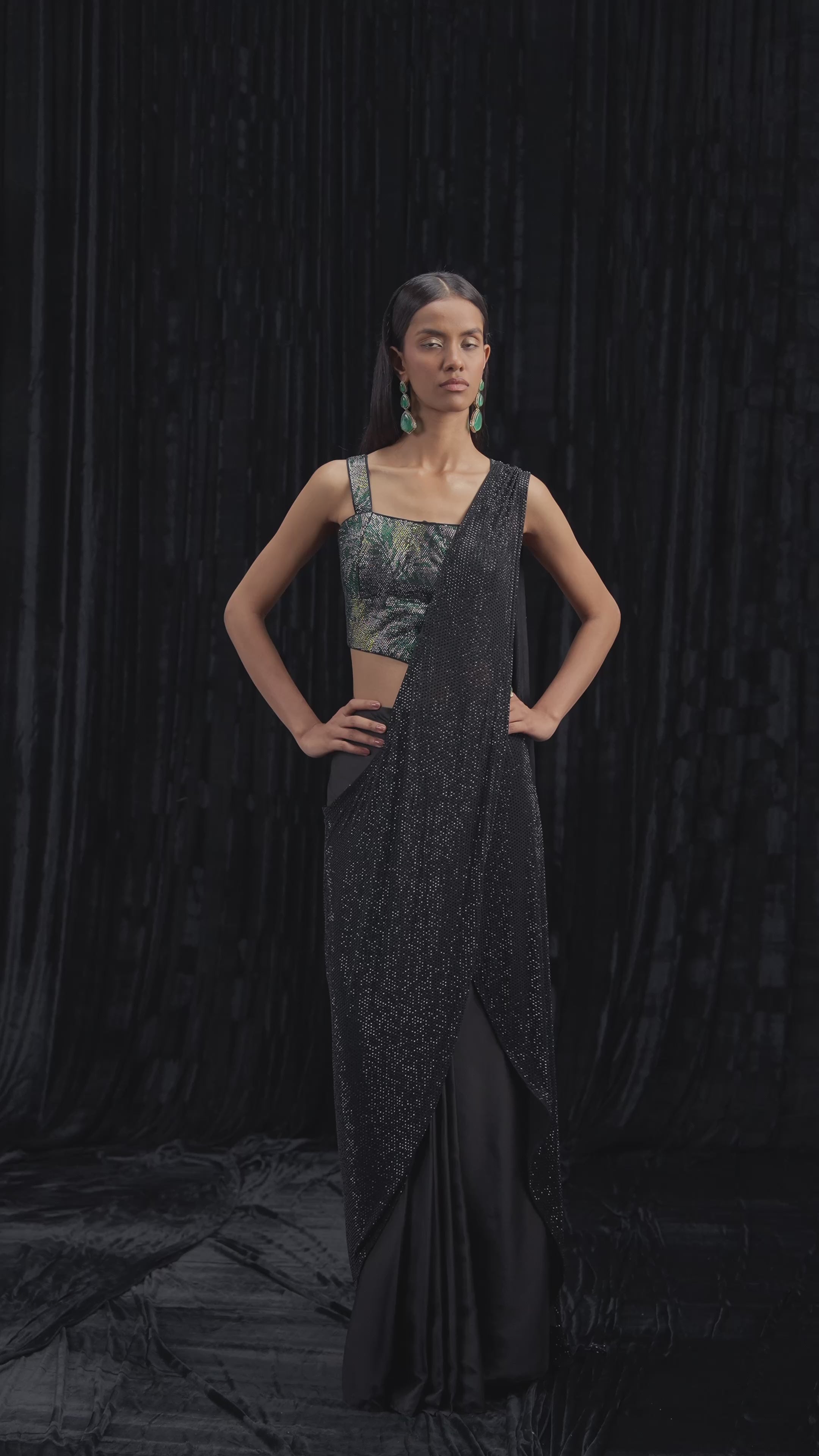 This sophisticated ensemble features a rich black satin silk drape saree that exudes modern elegance and grace. The sleek saree is paired with a striking embellished blouse, which adds a beautiful contrast with its intricate stone and sequin work. This look combines the timeless allure of black satin with a touch of contemporary sparkle, making it a perfect choice for a chic evening affair.