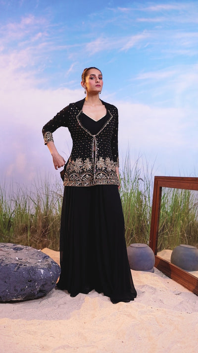 This striking three-piece cape set is perfect for cocktail events and formal receptions, offering a fusion silhouette with heavy hand-embellishment. It features a fitted Inner Crop Top/Bralette, a long-sleeved Jacket with an ornate peplum hem, and voluminous Wide-Legged Palazzo pants, all crafted from elegant Georgette Silk.